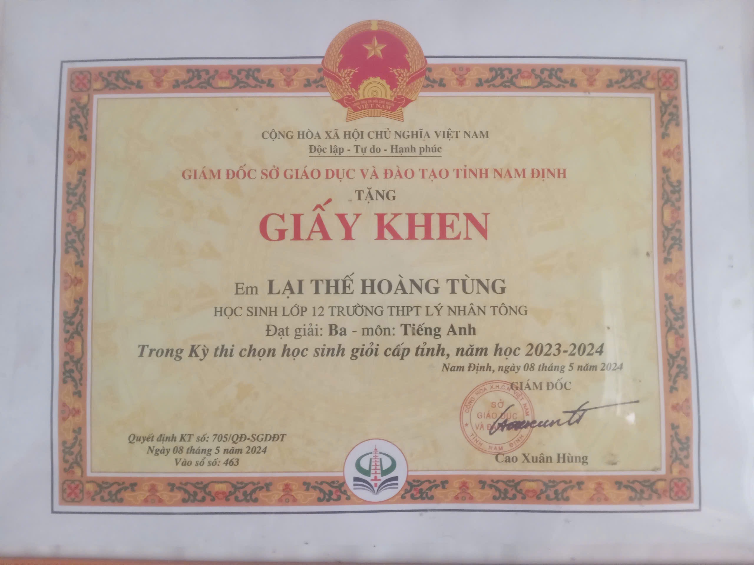 Giám đốc Sở Giáo dục và Đào tạo Tỉnh Nam Định tặng giấy khen cho Lại Thế Hoàng Tùng vì đã có thành tích xuất sắc, tiêu biểu trong năm học 2022-2023