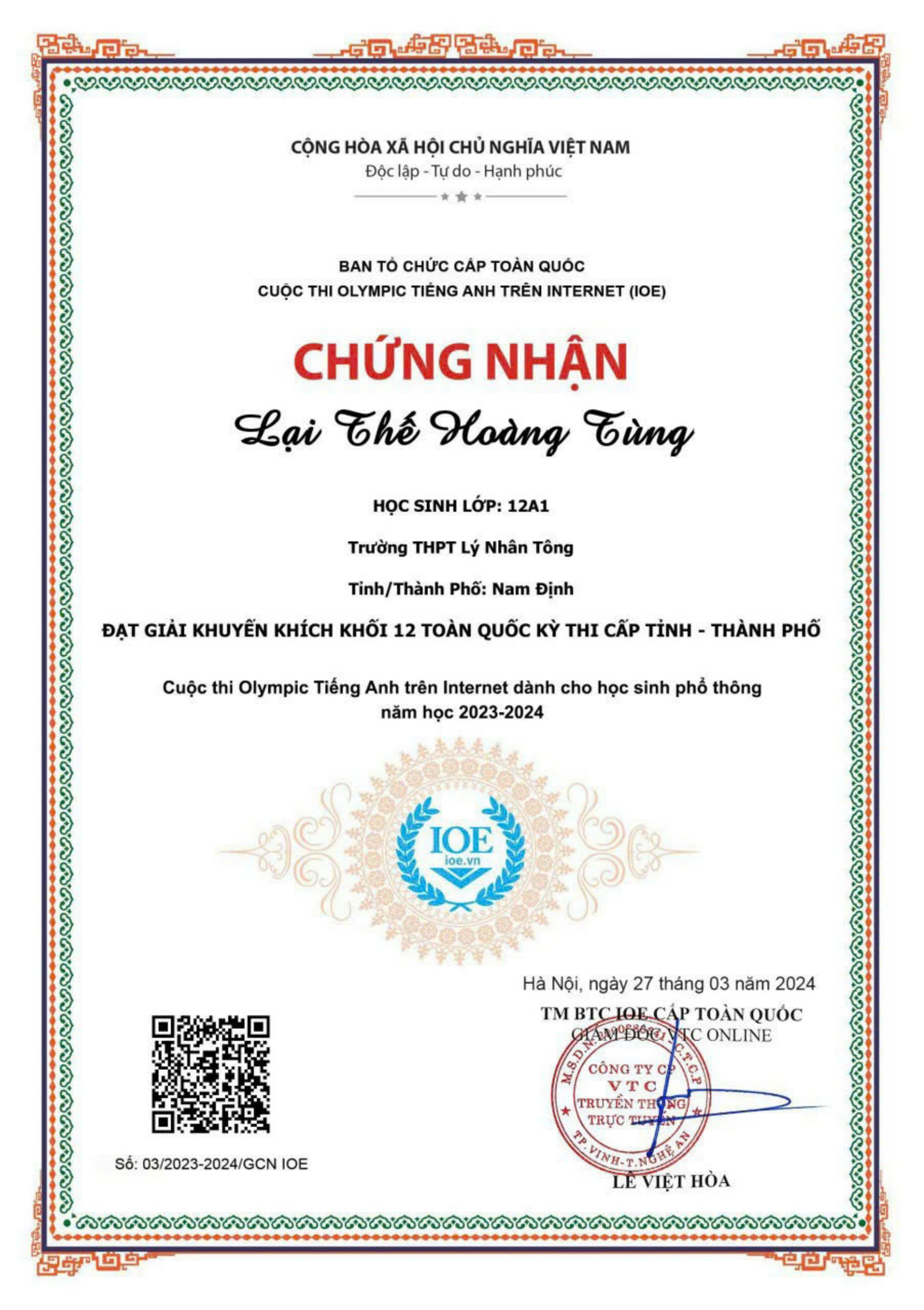 Lại Thế Hoàng Tùng đạt giải khuyễn khích khối 12 toàn Quốc kỳ thi cấp tỉnh - thành phố trong cuộc thi Olympic Tiếng Anh trên Internet dành cho học sinh THPT năm học 2023-2024