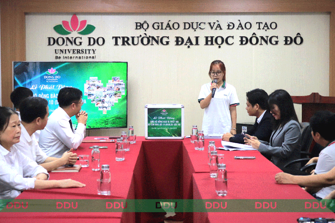 Ban Giám hiệu tham dự Lễ phát động Cùng với đó là sự tham gia của đại diện các phòng, ban, khoa, viện, trung tâm, cán bộ, giảng viên, nhân viên và đông đảo sinh viên toàn Trường. Sự có mặt đông đủ của tập thể lãnh đạo và cán bộ viên chức thể hiện rõ nét tinh thần đoàn kết và trách nhiệm cộng đồng, một trong những giá trị cốt lõi đã làm nên bản sắc riêng của Đại học Đông Đô trong suốt hơn ba thập kỷ phát triển. Lãnh Đạo Đảng ủy cùng Ban Giám hiệu cùng tập thể cán bộ, giảng viên, nhân viên Trường Đại học Đông Đô chia sẻ cùng đồng bào Nghệ An bị thiệt hại do bão số 10 (BUALOI) Trong những ngày đầu tháng 10, bão số 10 (Bualoi) đã gây mưa lớn, lũ quét và sạt lở nghiêm trọng tại nhiều tỉnh miền Trung, trong đó Nghệ An là một trong những địa phương chịu ảnh hưởng nặng nề nhất. Hàng trăm ngôi nhà bị tốc mái, hàng nghìn hecta hoa màu bị thiệt hại, cuộc sống của người dân gặp vô vàn khó khăn. Trước tình hình đó, Ban Lãnh đạo Trường Đại học Đông Đô đã nhanh chóng chỉ đạo phát động phong trào quyên góp ủng hộ đồng bào vùng lũ, kêu gọi toàn thể cán bộ, giảng viên, nhân viên và sinh viên chung tay góp sức, thể hiện tinh thần “Đông Đô vì cộng đồng – Gắn kết sẻ chia”. Phát biểu tại buổi lễ, TS. Nguyễn Đình Tân – Phó Hiệu trưởng phụ trách Trường chia sẻ: “Những mất mát của đồng bào Nghệ An là nỗi đau chung của dân tộc. Mỗi sự đóng góp, dù nhỏ bé, đều là nguồn động viên lớn lao gửi đến những người đang oằn mình trong khó khăn. Đông Đô không chỉ là nơi dạy tri thức, mà còn là nơi nuôi dưỡng lòng nhân ái, khơi dậy ý thức sống vì cộng đồng.” TS. Nguyễn Đình Tân – Phó Hiệu trưởng phụ trách Trường chia sẻ cùng đồng bào Nghệ An bị thiệt hại do bão số 10 (BUALOI) Tiếp lời lãnh đạo Nhà trường, TS. Nguyễn Anh Tuấn – Phó Hiệu trưởng nhấn mạnh: “Hoạt động quyên góp hôm nay không chỉ là sự giúp đỡ vật chất mà còn là bài học sâu sắc về lòng nhân ái. Chúng ta – những người thầy, người trò Đông Đô – hãy cùng nhau lan tỏa năng lượng tích cực, để tinh thần sẻ chia trở thành một phần trong văn hóa sống và học tập của mỗi sinh viên.” TS. Nguyễn Anh Tuấn – Phó Hiệu trưởng chia sẻ cùng đồng bào Nghệ An bị thiệt hại do bão số 10 (BUALOI) Đại diện cho sinh viên toàn Trường, bạn Dương Huệ Tường Vi – sinh viên khóa 30 ngành Ngôn ngữ Trung Quốc, phát biểu đầy xúc động: “Là sinh viên, chúng em luôn được thầy cô giáo dục về trách nhiệm xã hội và tình yêu thương con người. Khi nhìn thấy hình ảnh đồng bào Nghệ An oằn mình trong mưa lũ, chúng em không thể đứng ngoài. Dù chỉ là một phần nhỏ bé, nhưng chúng em tin rằng mỗi tấm lòng góp lại sẽ tạo thành dòng chảy yêu thương lớn lao, giúp sưởi ấm trái tim những người đang chịu mất mát.” Đại diện cho sinh viên toàn Trường, bạn Dương Huệ Tường Vi – sinh viên khóa 30 ngành Ngôn ngữ Trung Quốc, phát biểu đầy xúc động tại Lễ phát động Bạn Vi cũng chia sẻ thêm rằng phong trào quyên góp của Trường đã nhận được sự hưởng ứng mạnh mẽ của sinh viên các khoa, viện. Nhiều bạn đã chủ động kêu gọi, lan tỏa thông điệp nhân ái đến bạn bè, cộng đồng mạng, mong muốn “biến sự cảm thông thành hành động thiết thực.” Phát biểu của sinh viên đã tạo nên khoảnh khắc đặc biệt xúc động trong buổi lễ, thể hiện tinh thần đoàn kết giữa các thế hệ – nơi thầy và trò cùng chung một nhịp đập hướng về miền Trung thân yêu. Toàn bộ số tiền quyên góp sẽ được Nhà trường tổng hợp, công khai minh bạch và phối hợp cùng Ủy ban Mặt trận Tổ quốc Việt Nam tỉnh Nghệ An để trực tiếp trao đến tay người dân tại các vùng bị ảnh hưởng nặng nề nhất. Hoạt động được tổ chức với tinh thần thiết thực, đảm bảo mọi đóng góp của thầy và trò Trường Đại học Đông Đô đều đến đúng nơi, đúng người, mang lại giá trị thật sự cho cộng đồng. Trải qua hơn 31 năm xây dựng và phát triển, Trường Đại học Đông Đô không chỉ khẳng định uy tín trong lĩnh vực giáo dục – đào tạo, mà còn được biết đến là ngôi trường luôn đặt giá trị con người, lòng nhân ái và tinh thần cống hiến lên hàng đầu. Các hoạt động thiện nguyện, đền ơn đáp nghĩa, hiến máu nhân đạo, hỗ trợ vùng khó khăn, xây nhà tình nghĩa, trao học bổng vì cộng đồng… đã trở thành truyền thống tốt đẹp được duy trì đều đặn, góp phần xây dựng hình ảnh sinh viên Đông Đô năng động, nghĩa tình và trách nhiệm. Với phương châm “Giáo dục không chỉ là tri thức, mà còn là nuôi dưỡng lòng nhân ái”, mỗi hoạt động cộng đồng của Nhà trường đều hướng đến mục tiêu bồi đắp nhân cách, hun đúc tình yêu thương con người và tinh thần hướng thiện trong thế hệ trẻ. Khép lại buổi lễ, không khí xúc động vẫn đọng lại trong ánh mắt, nụ cười
