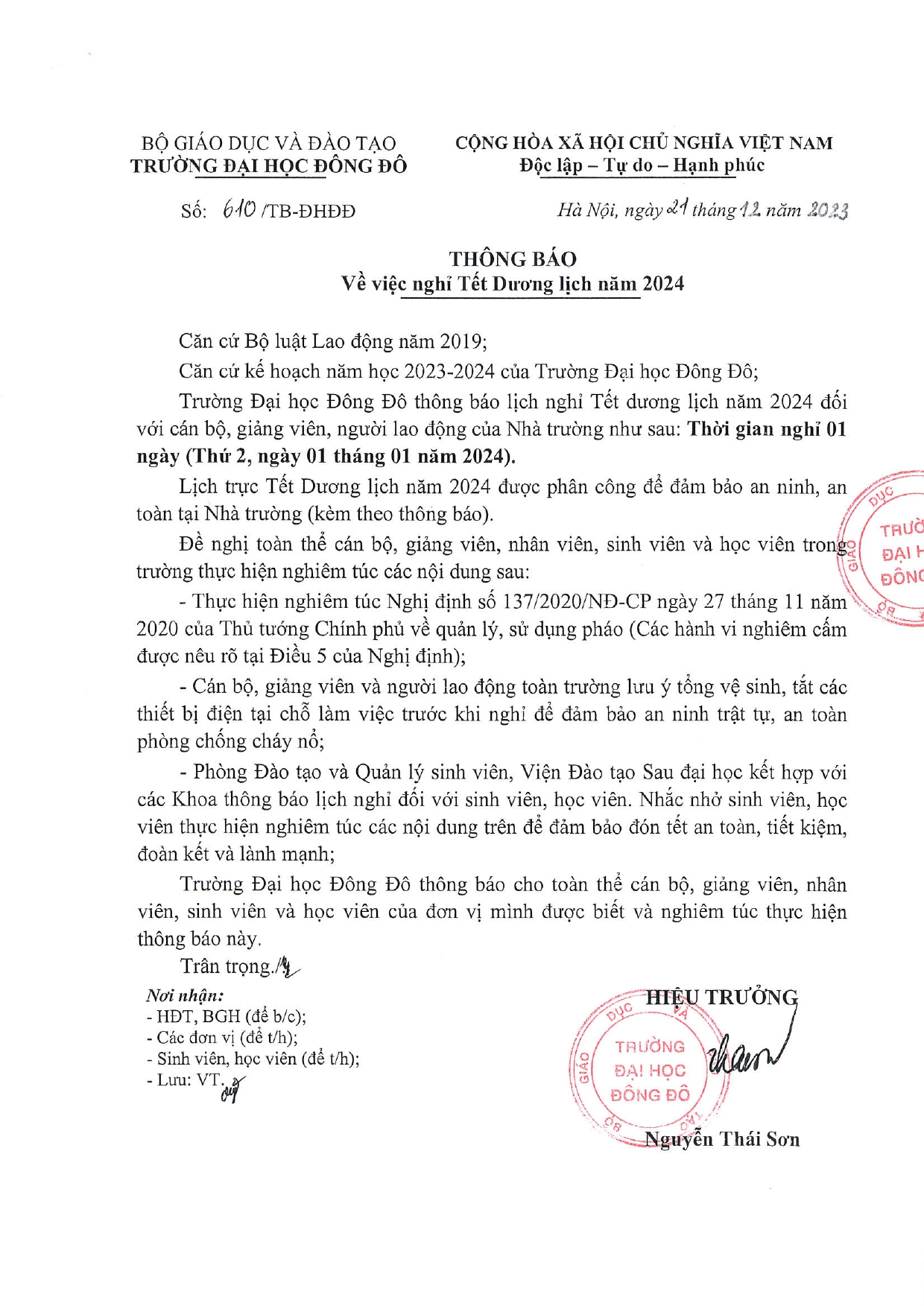 Thông báo số: 610/TB-ĐHĐĐ V/v nghỉ Tết Dương lịch năm 2024