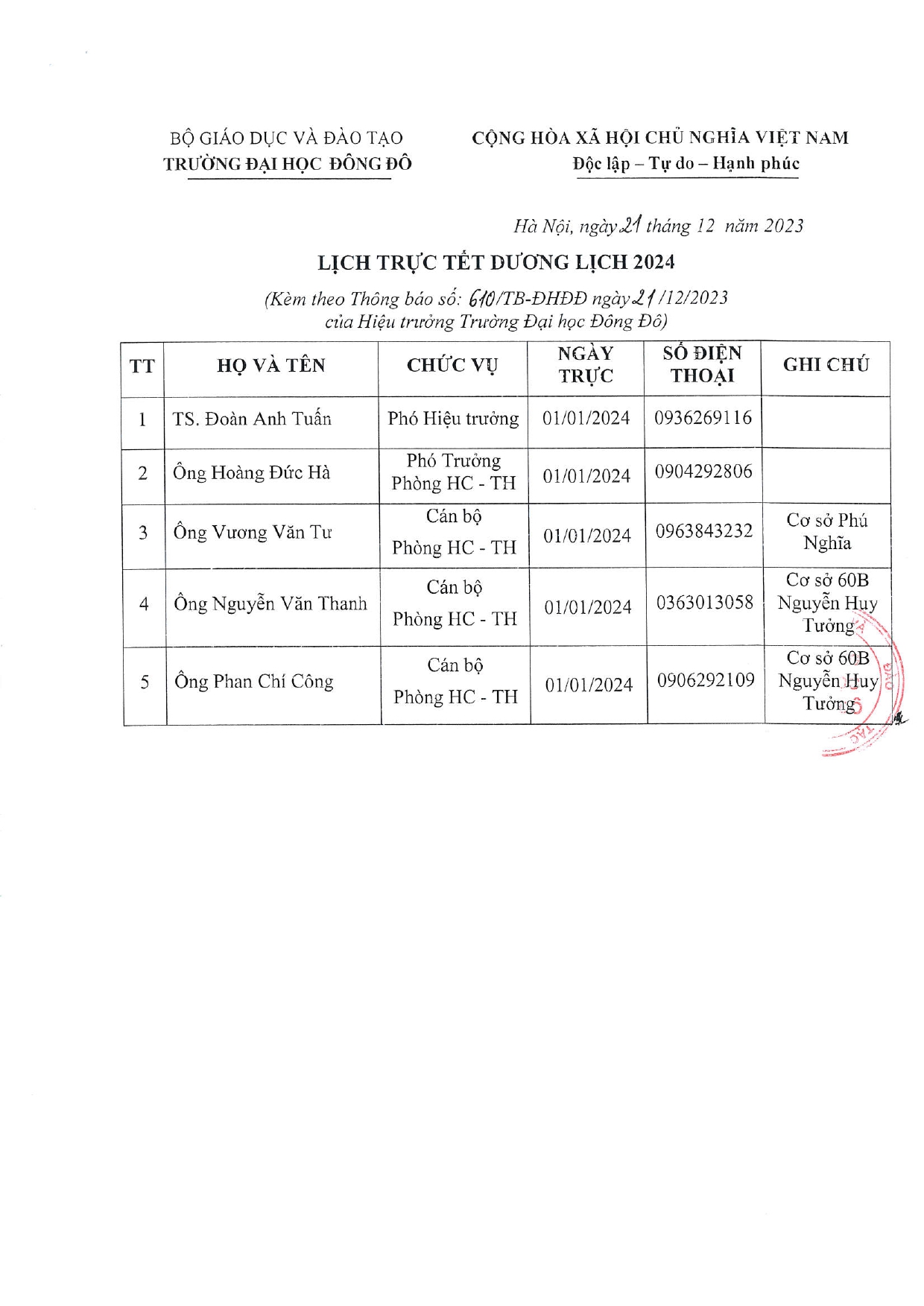 Trường Đại học Đông Đô thông báo lịch nghỉ Tết Dương lịch 2024