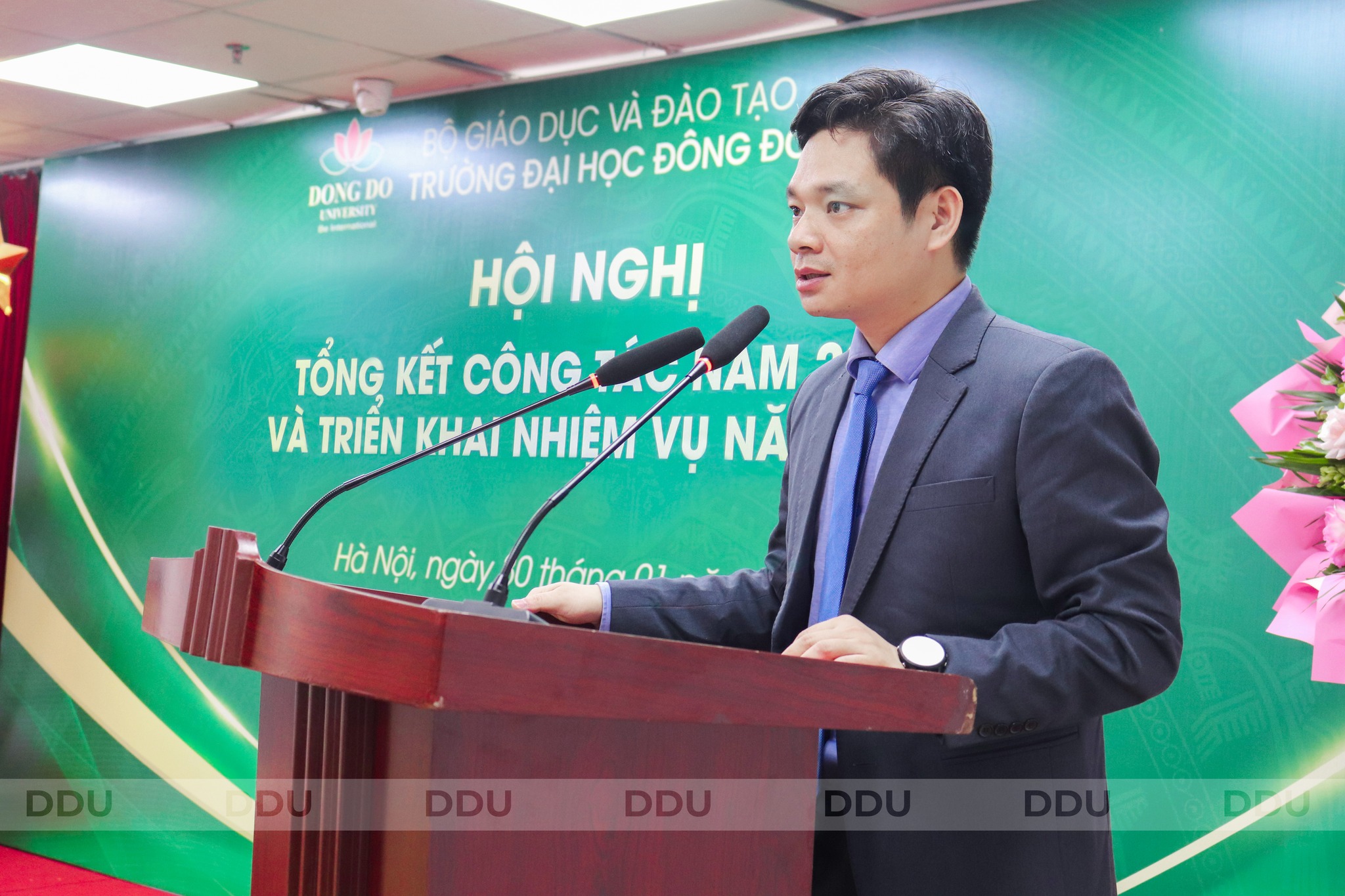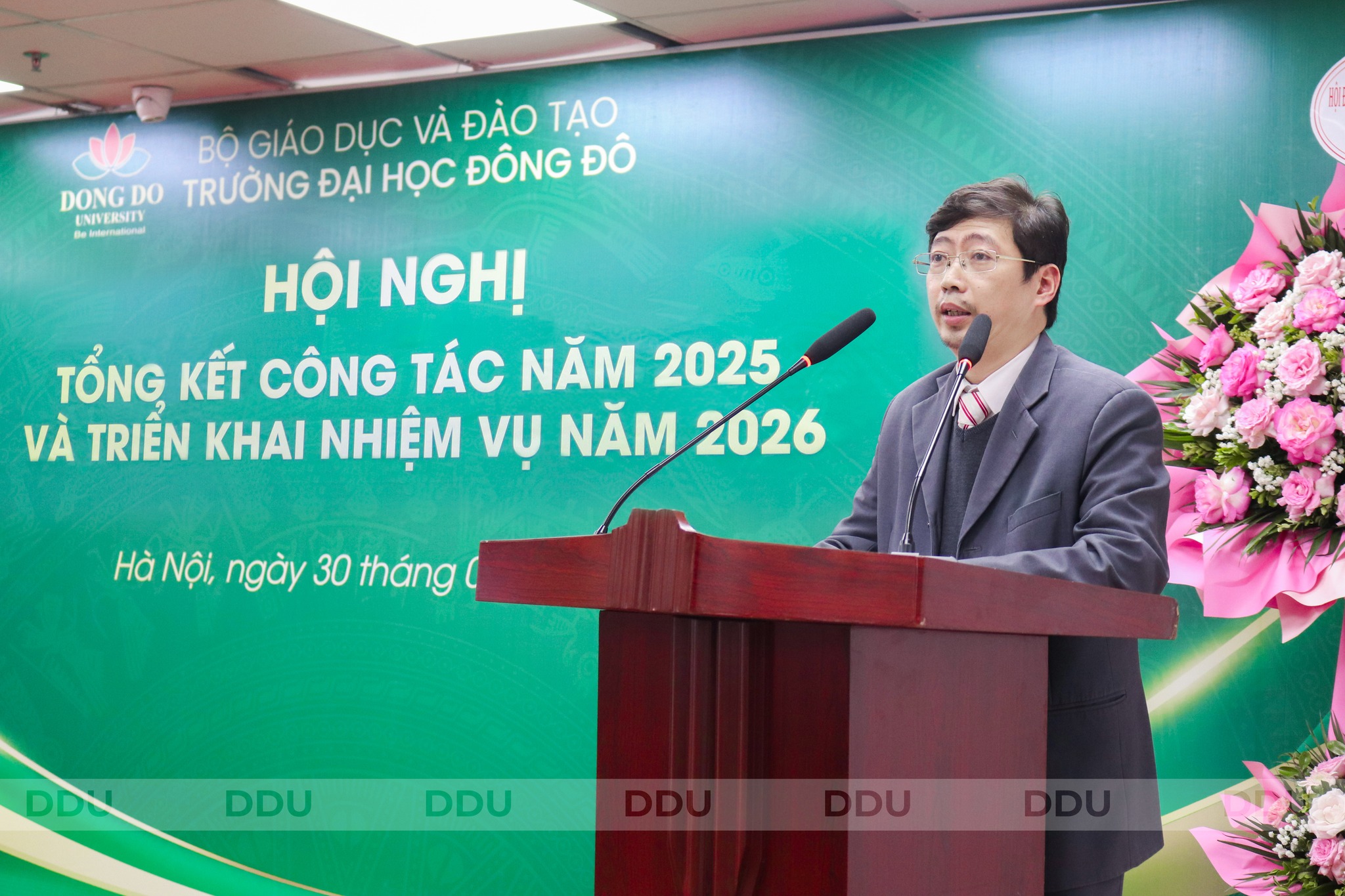 Theo báo cáo Tổng kết công tác năm 2025 và đưa ra phương hướng, nhiệm vụ năm 2026, năm 2025 vừa qua, trong bối cảnh giáo dục đại học có nhiều thay đổi mang tính chiến lược, tập thể Trường Đại học Đông Đô đã nỗ lực duy trì ổn định hoạt động, giữ vững nền nếp đào tạo và quản lý. Công tác giảng dạy từng bước được củng cố; đội ngũ cán bộ, giảng viên cơ bản ổn định; hoạt động đào tạo, quản lý và phục vụ được duy trì thông suốt. Một số hoạt động chuyên môn, hợp tác, nghiên cứu khoa học và phục vụ người học có chuyển biến tích cực, tạo nền tảng cho giai đoạn phát triển tiếp theo. Toàn thể cán bộ và nhân viên trường làm lễ chào cờ Tuy nhiên, Hội nghị cũng thẳng thắn nhìn nhận những thách thức còn tồn tại cần tiếp tục đổi mới để theo kịp yêu cầu ngày càng cao của xã hội và tiến trình đổi mới giáo dục đại học. Bước sang năm 2026, Trường Đại học Đông Đô xác định phương hướng xuyên suốt là: “Tiếp tục ổn định tổ chức - nâng cao chất lượng đào tạo - tăng cường kỷ cương, trách nhiệm - đẩy mạnh nghiên cứu khoa học và đổi mới sáng tạo - lấy người học và người lao động làm trung tâm”. Thay mặt Ban Giám hiệu, TS. Nguyễn Anh Tuấn - Hiệu trưởng Nhà trường đã trình bày 10 nhóm nhiệm vụ trọng tâm gồm: TS. Nguyễn Anh Tuấn - Hiệu trưởng Nhà trường phát biểu tại Hội nghị 1. Thúc đẩy chuyển đổi số toàn diện trong quản lý và đào tạo Tập trung đẩy mạnh ứng dụng công nghệ số trong công tác quản lý, điều hành, quản lý đào tạo, tài chính, nhân sự và các dịch vụ phục vụ người học; từng bước hoàn thiện và khai thác hiệu quả hệ thống quản lý học tập (LMS), hệ thống quản lý đào tạo và quản trị nội bộ; thực hiện số hóa hồ sơ, dữ liệu và quy trình nghiệp vụ nhằm nâng cao hiệu quả, tính minh bạch và khả năng kết nối. Đồng thời, tổ chức đào tạo, bồi dưỡng nâng cao năng lực ứng dụng công nghệ số cho đội ngũ cán bộ, giảng viên và người lao động. 2. Đổi mới hoạt động giảng dạy theo hướng hiện đại, thực chất Tiếp tục đổi mới nội dung, chương trình và phương pháp giảng dạy theo định hướng lấy người học làm trung tâm; tăng cường ứng dụng công nghệ thông tin, học liệu số, bài giảng điện tử và các phương pháp dạy học tích cực; chú trọng gắn kết chặt chẽ giữa lý thuyết và thực hành, giữa đào tạo với thực tiễn sản xuất, kinh doanh và nhu cầu của thị trường lao động. 3. Tăng cường chất lượng đội ngũ cán bộ, giảng viên và các điều kiện đảm bảo chất lượng phục vụ đào tạo Xây dựng và triển khai kế hoạch đào tạo, bồi dưỡng đội ngũ cán bộ, giảng viên theo hướng chuẩn hóa và nâng cao chất lượng; chú trọng nâng cao trình độ chuyên môn, nghiệp vụ, kỹ năng sư phạm, năng lực nghiên cứu khoa học và chuyển đổi số. Khuyến khích, tạo điều kiện để giảng viên học tập nâng cao trình độ; thực hiện hiệu quả công tác đánh giá, quy hoạch, sử dụng và phát huy năng lực đội ngũ, đáp ứng yêu cầu phát triển của Nhà trường. 4. Đẩy mạnh hoạt động nghiên cứu khoa học của cán bộ, giảng viên và sinh viên Khuyến khích và tạo điều kiện thuận lợi để cán bộ, giảng viên và sinh viên tham gia nghiên cứu khoa học; nâng cao chất lượng các đề tài, sáng kiến, bài báo khoa học và hội thảo chuyên môn; từng bước hình thành các nhóm nghiên cứu theo lĩnh vực thế mạnh. Gắn hoạt động nghiên cứu khoa học với công tác giảng dạy, học tập và giải quyết các vấn đề thực tiễn của Nhà trường và xã hội. 5. Đổi mới phương thức tuyển sinh, tăng cường ứng dụng công nghệ Đa dạng hóa các hình thức và phương thức tuyển sinh phù hợp với từng ngành, từng đối tượng người học; đẩy mạnh truyền thông tuyển sinh trên các nền tảng số; ứng dụng công nghệ trong việc theo dõi, phân tích, đánh giá mức độ quan tâm và nhu cầu của người học; nâng cao hiệu quả công tác tư vấn tuyển sinh, từng bước nâng cao chất lượng nguồn tuyển đầu vào. 6. Phát triển và đa dạng hóa các chương trình đào tạo Tập trung phát triển các chương trình đào tạo từ xa, đào tạo trực tuyến; mở rộng các chương trình liên kết quốc tế, chương trình đào tạo ngắn hạn và các chương trình bồi dưỡng theo nhu cầu xã hội. Từng bước xây dựng và phát triển Trung tâm tiếng Việt phục vụ người nước ngoài và các chương trình đào tạo đặc thù, góp phần mở rộng quy mô, nâng cao uy tín và hiệu quả đào tạo của Nhà trường. 7. Thúc đẩy các hoạt động, phong trào sinh viên Tăng cường tổ chức và tạo điều kiện để sinh viên tham gia các hoạt động học thuật, nghiên cứu khoa học, đổi mới sáng tạo và khởi nghiệp; khuyến khích sinh viên tham gia các cuộc thi sáng tạo, khởi nghiệp do Bộ, ngành và các trường đại học phát động; góp phần rèn luyện kỹ năng, bản lĩnh, tinh th