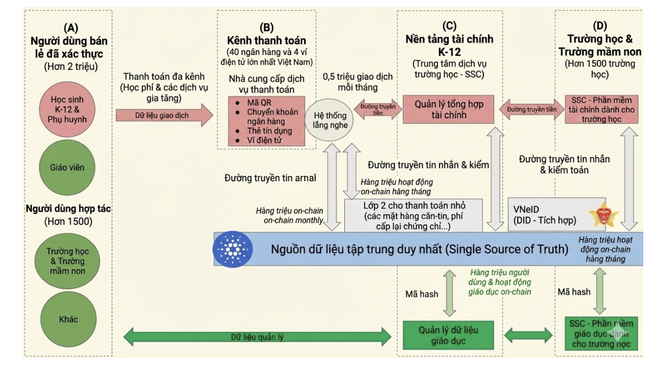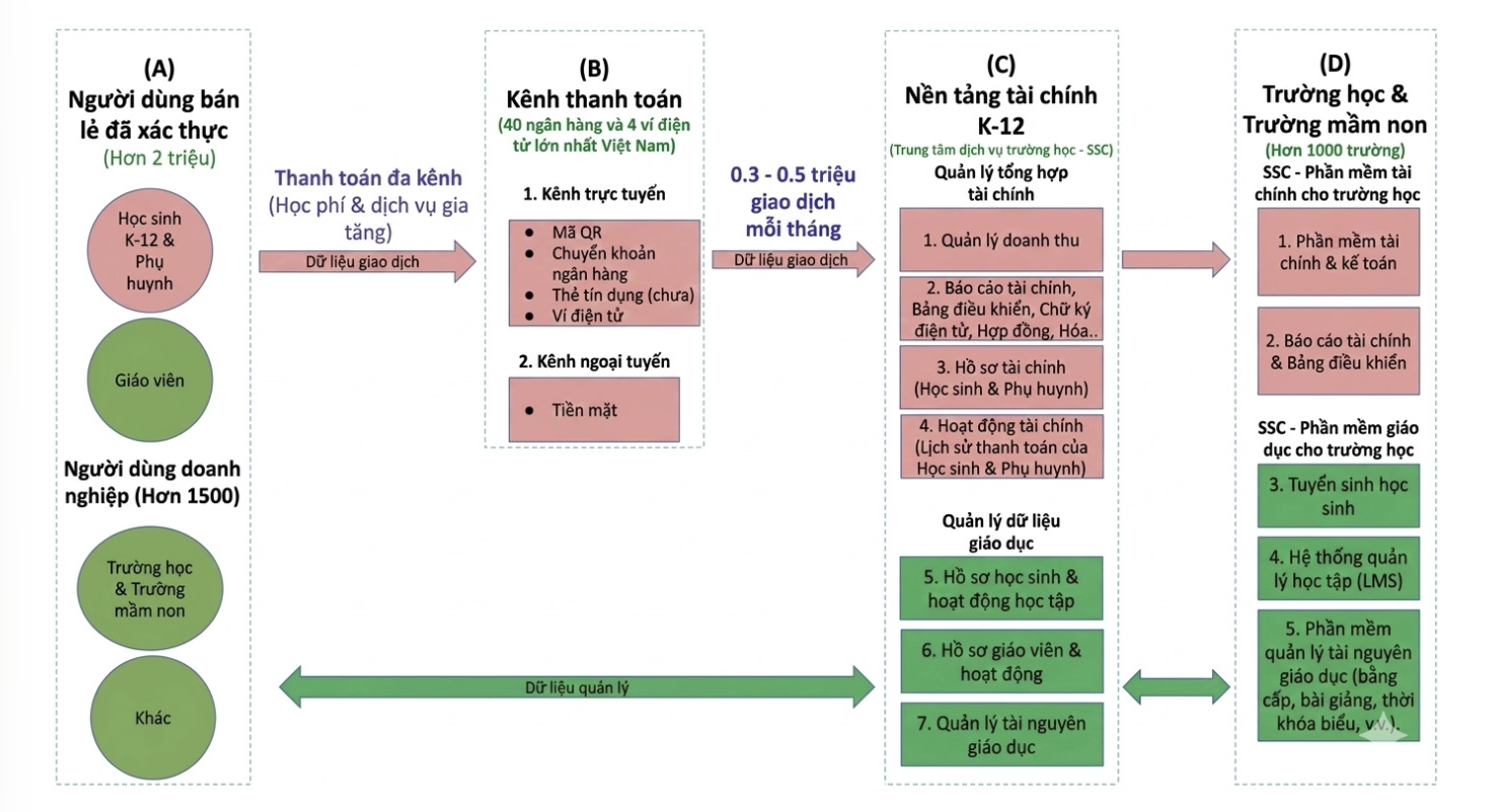 Trong bối cảnh hệ thống giáo dục K-12 đang từng bước thúc đẩy thanh toán không dùng tiền mặt, cấu trúc vận hành hiện tại đang bộc lộ một số giới hạn về mặt hạ tầng. Đặc điểm nổi bật là sự phân mảnh dữ liệu giữa các tổ chức tài chính, ngân hàng và hệ thống phần mềm quản lý của nhà trường, từ đó hình thành nên những "ốc đảo dữ liệu" (data silos) thiếu sự đồng bộ.