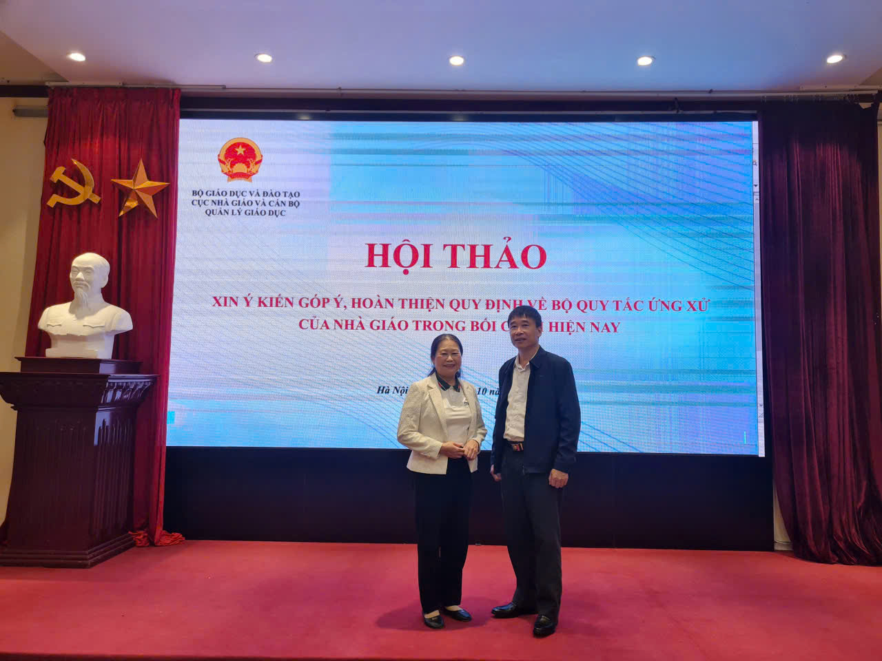 Hội thảo có sự tham dự của đông đảo cán bộ quản lý, giảng viên, nhà giáo đến từ nhiều cơ sở giáo dục trên địa bàn Hà Nội. Các đại biểu đã được nghe báo cáo về việc triển khai Luật Nhà giáo (Luật số 73/2025/QH15) cùng định hướng xây dựng Thông tư quy định Quy tắc ứng xử của nhà giáo trong cơ sở giáo dục.