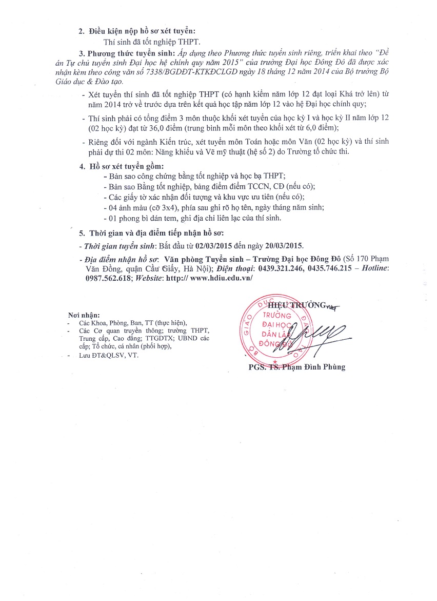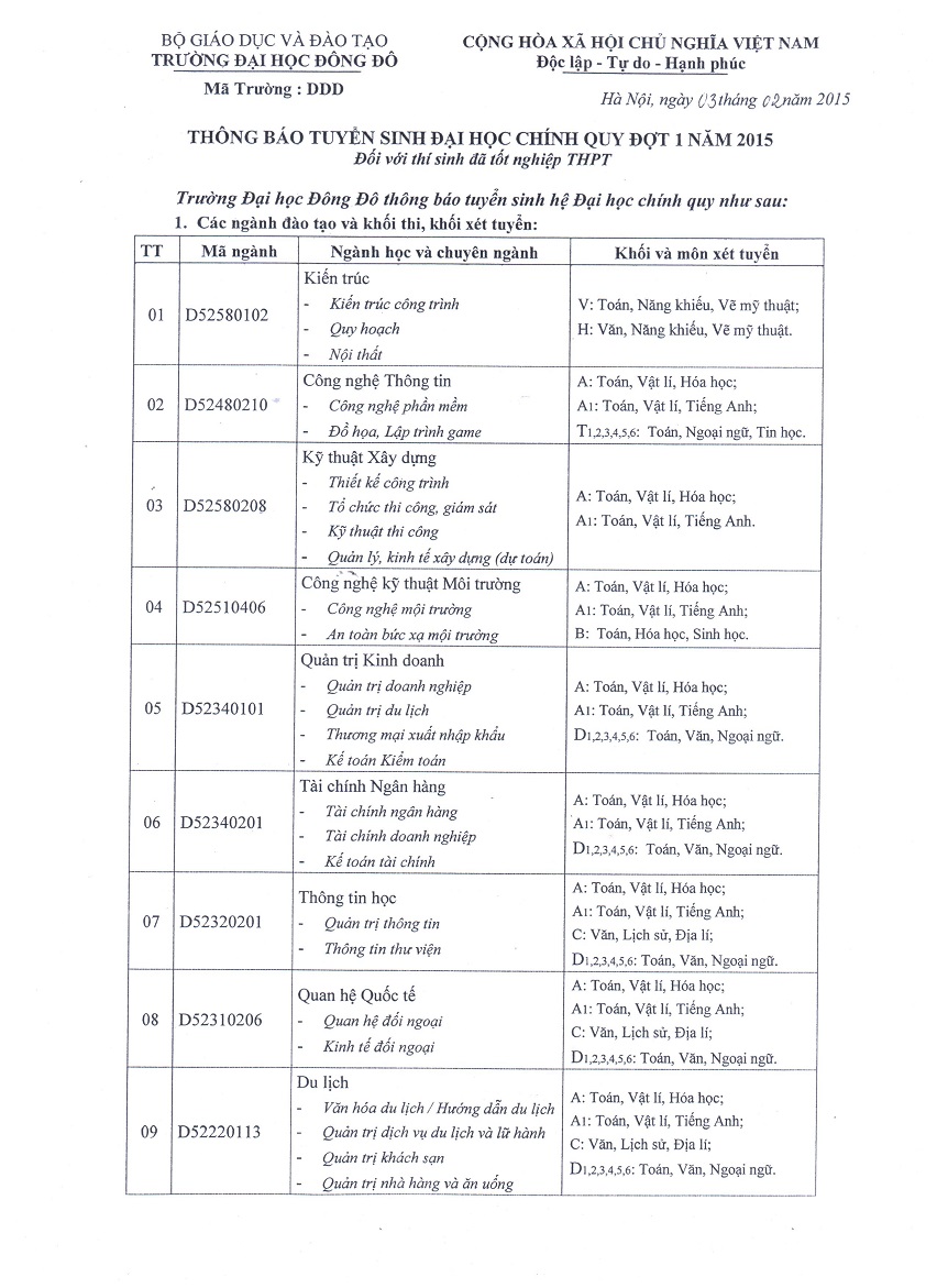 Trường đại học Đông Đô thông báo tuyển sinh đại học chính quy đợt 1 năm 2015