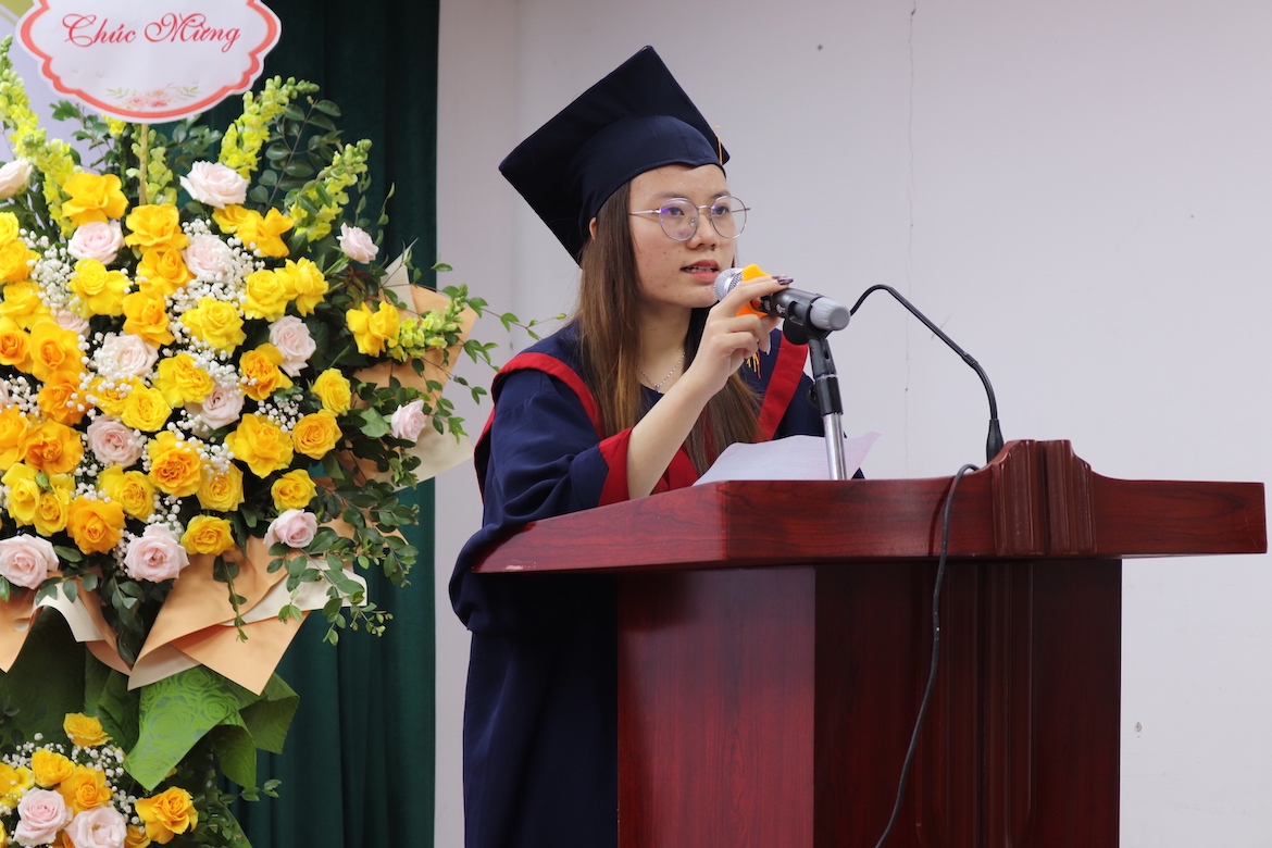 Đại diện các tân Cử nhân tốt nghiệp năm 2023, tân Cử nhân Nguyễn Thị Huệ - tân Cử nhân ngành Ngôn ngữ Trung Quốc với GPA 3.75 đạt kết quả học tập loại xuất sắc bày tỏ sự bồi hồi xúc động về hành trình học tập và rèn luyện tại Trường Đại học Đông Đô. Bạn Huệ chia sẻ: “Trong thời gian học tập tại Trường, khó khăn có, hạnh phúc có, thử thách có, cố gắng có, nản lòng cũng có nhưng chắc chắn 4 năm vừa qua 154 bạn sinh viên tốt nghiệp tại đây đều đã vượt qua một hành trình thanh xuân đáng nhớ. Để rồi ngày hôm nay em và các bạn đều đã trưởng thành hơn, được trang bị hành trang kiến thức vững vàng để sẵn sàng bước ra đời, đóng góp trí tuệ và sức lực để cống hiến cho quê hương, đất nước.” Tân Cử nhân Nguyễn Thị Huệ cũng thay mặt các tân Cử nhân tốt nghiệp năm 2023 gửi cảm ơn và lẵng hoa tươi thắm đến ban lãnh đạo, các thầy/cô, cán bộ nhân viên Trường Đại học Đông Đô đã tạo điều kiện tốt nhất cho các bạn trong suốt quá trình học tập tại trường.