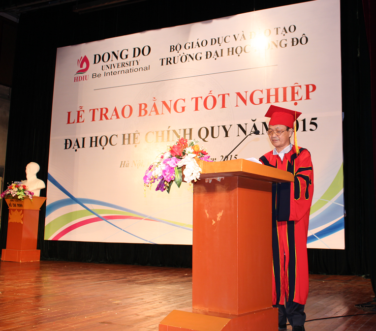 Phát biểu tại buổi lễ, PGS.TS.NGƯT Phạm Đình Phùng – Hiệu trưởng nhà trường nhiệt liệt biểu dương và chúc mừng tất cả các tân Kỹ sư, Kiến trúc sư, Cử nhân đã đạt thành tích cao trong học tập và rèn luyện dưới mái trường Đại học Đông Đô và căn dặn các bạn sinh viên tốt nghiệp năm 2015 “việc tốt nghiệp đại học mới chỉ là bước đầu, chặng đường sắp tới của các em mới quan trọng và chắc chắn sẽ gặp nhiều thử thách vì các em bước sang môi trường mới có tính cạnh tranh cao. Vì vậy, đòi hỏi các em phải tiếp tục phấn đấu vươn lên cả về đạo đức và năng lực chuyên môn để có khả năng thích ứng cao với môi trường đó. Dù các em công tác ở các lĩnh vực và môi trường khác nhau, tôi mong muốn các em luôn theo dõi sự phát triển của trường, có mối quan hệ tích cực với nhà trường; biết kế tục và phát huy những truyền thống tốt đẹp của các thế hệ sinh viên lớp trước, có những đóng góp và ảnh hưởng tích cực đến tương lai phát triển và sự lớn mạnh của Đại học Đông Đô”.