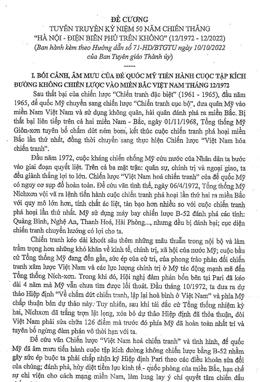 Đề cương Tuyên truyền kỷ niệm 50 năm chiến thắng "Hà Nội - Điện Biên Phủ trên không" (12/1972 - 12/2022)
