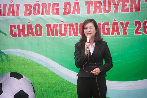 ThS. Trần Kim Oanh - Phó Hiệu trưởng phát biểu khai mạc và động viên tinh thần các cầu thủ trước giải đấu