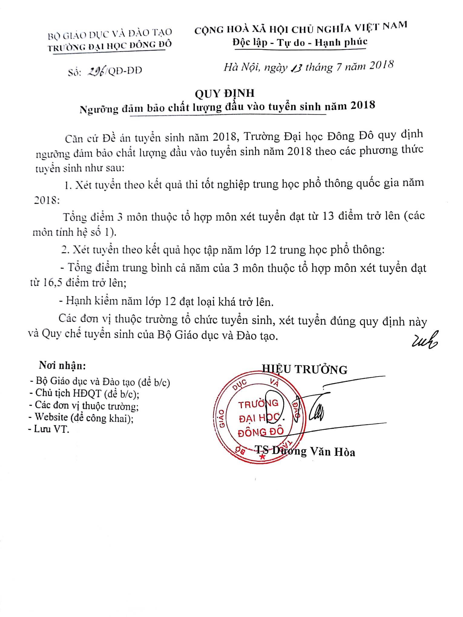 Căn cứ Đề án tuyển sinh năm 2018, Trường Đại học Đông Đô quy định ngưỡng đảm bảo chất lượng đầu vào tuyển sinh năm 2018 theo các phương thức tuyển sinh như sau: