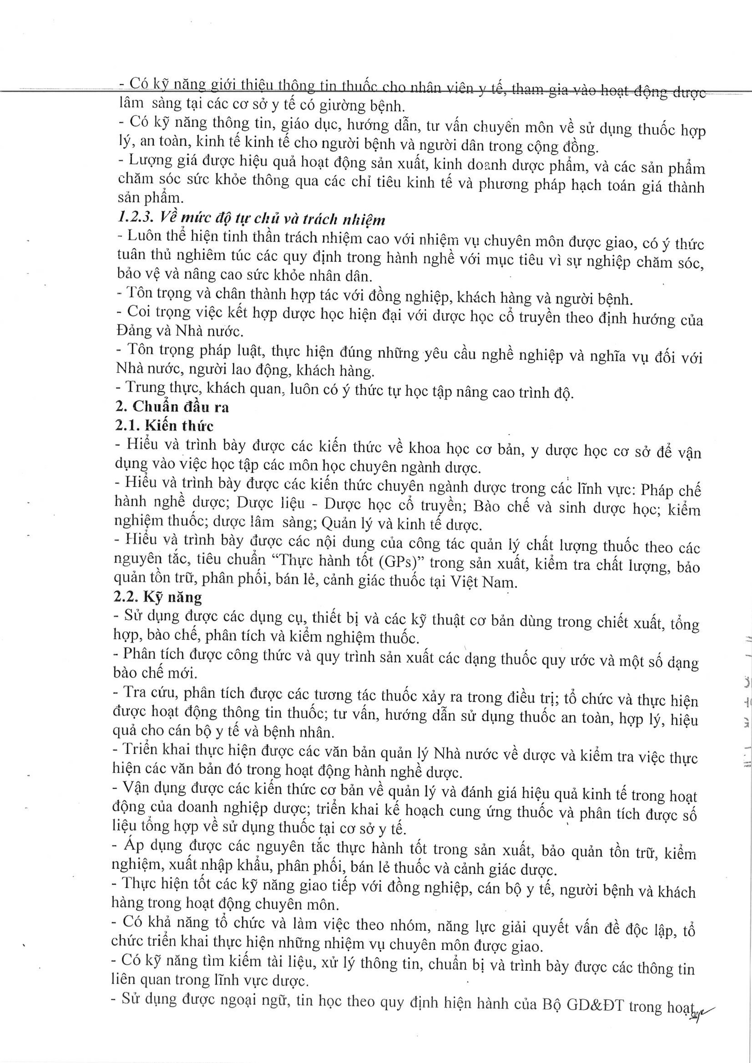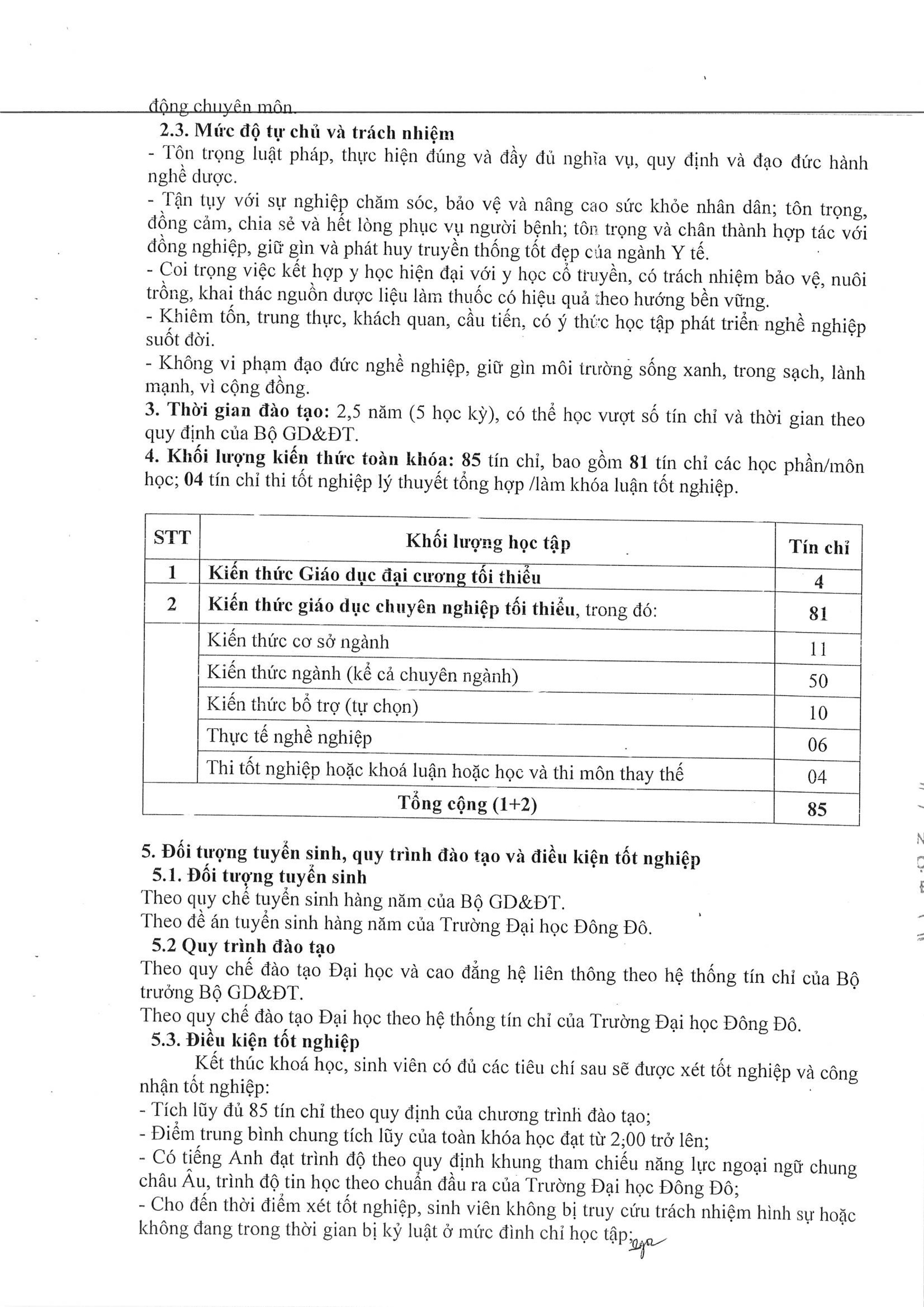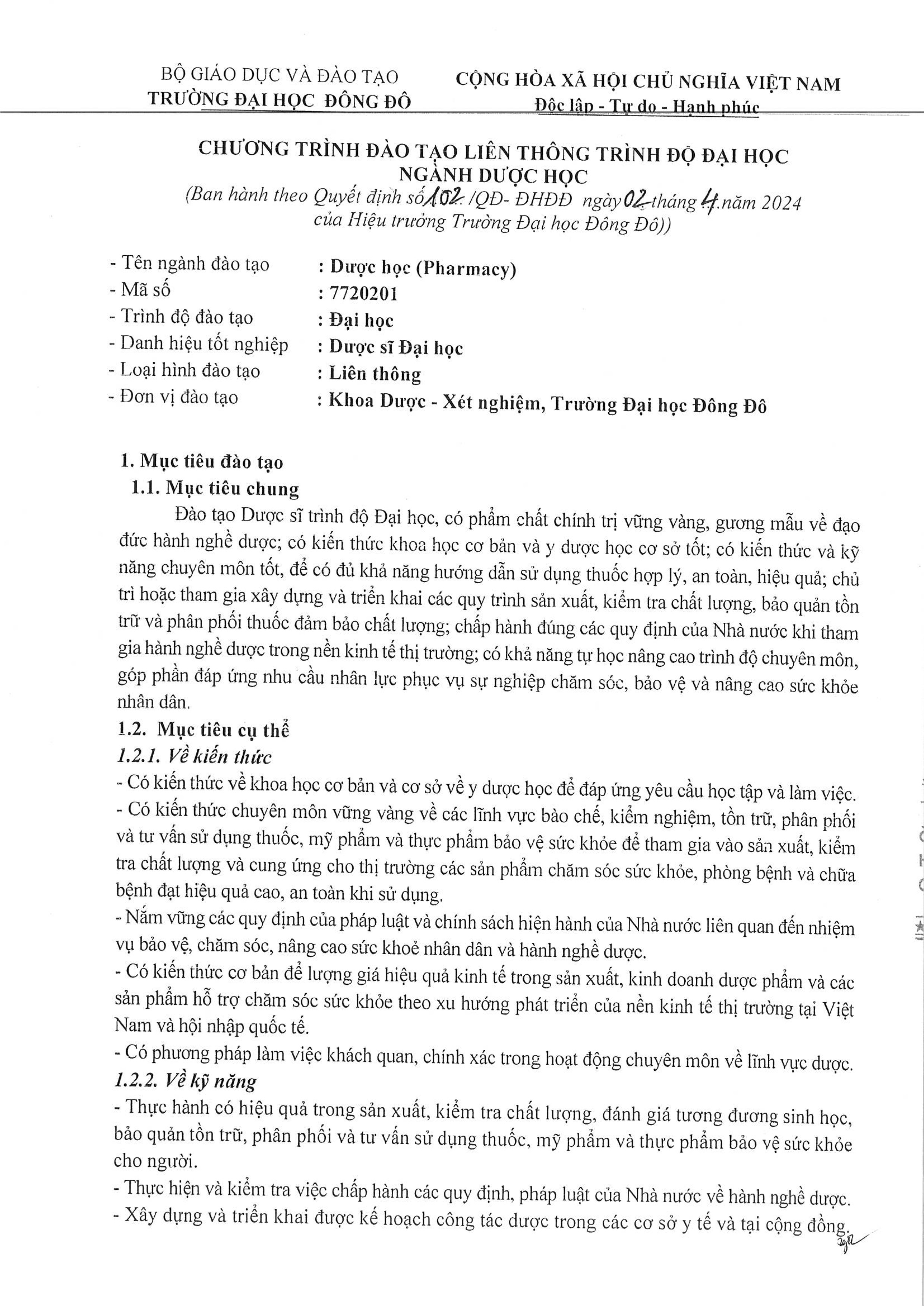 Quyết định số 102/QĐ-ĐHĐĐ của Hiệu trưởng Trường Đại học Đông Đô về việc ban hành "Chương trình đào tạo liên thông trình độ Đại học ngành Dược học, mã ngành: 7720201"
