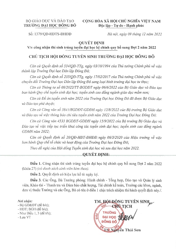 Quyết định công nhận thí sinh trúng tuyển đại học hệ chính quy bổ sung Đợt 2 năm 2022