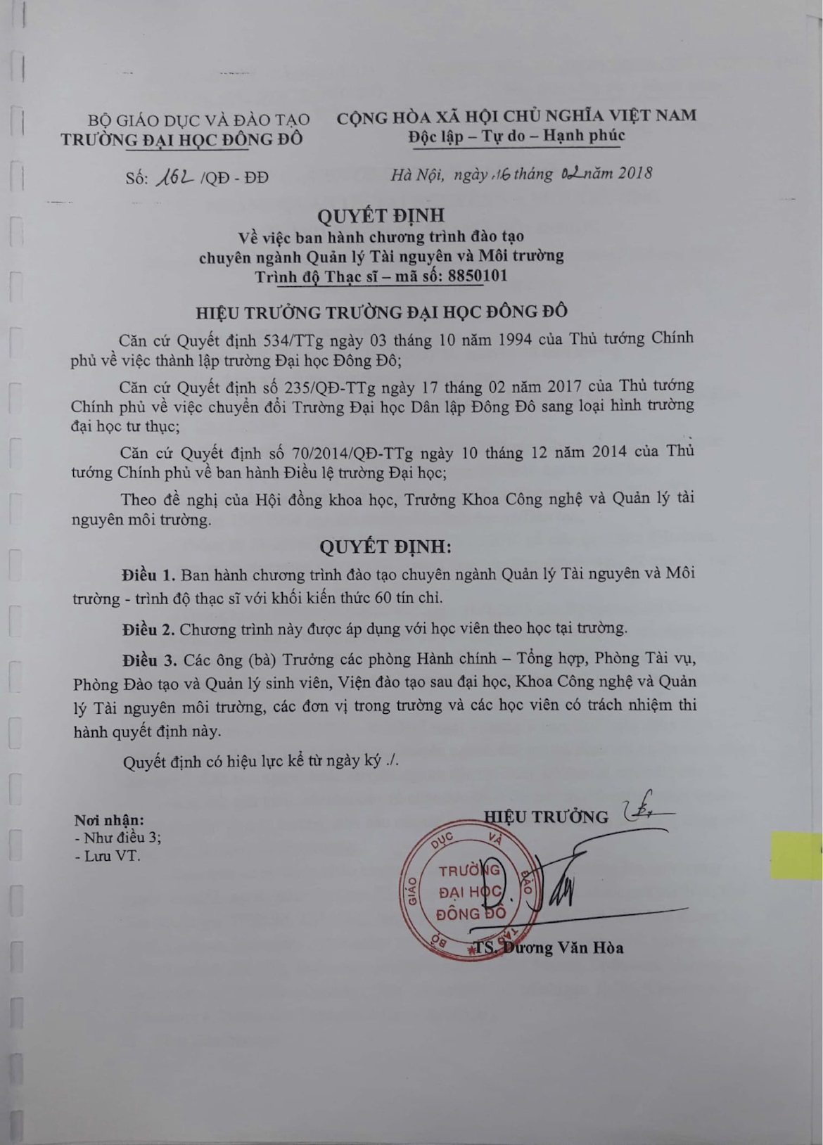 Quyết định về việc ban hành chương trình đào tạo chuyên ngành Quản lý Tài nguyên và Môi trường Trình độ Thạc sĩ – mã số: 8850101