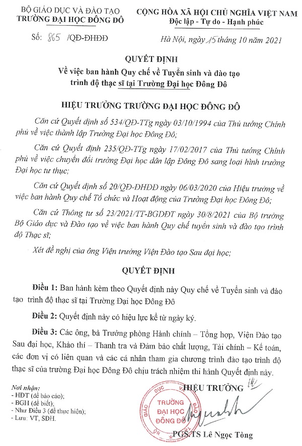 Quyết định về việc ban hành Quy chế về Tuyển sinh và đào tạo trình độ thạc sĩ tại Trường Đại học Đông Đô