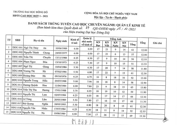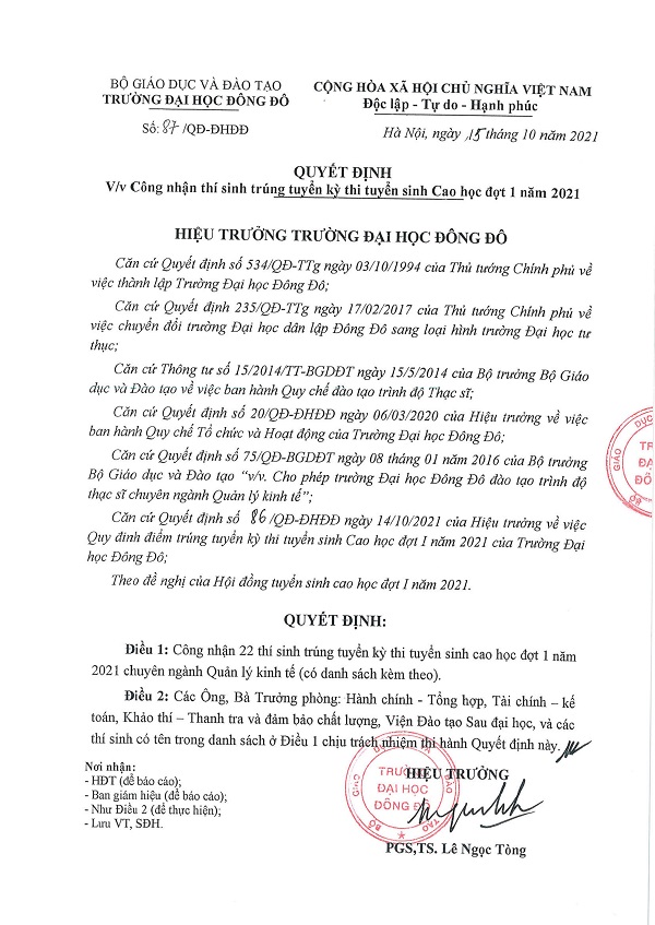 Quyết định về việc công nhận thí sinh trúng tuyển kỳ thi tuyển sinh Cao học đợt 1 năm 2021