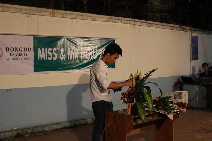 Một nam thí sinh đang rất chăm chú thể hiện phần thi tài năng cắm hoa của mình
