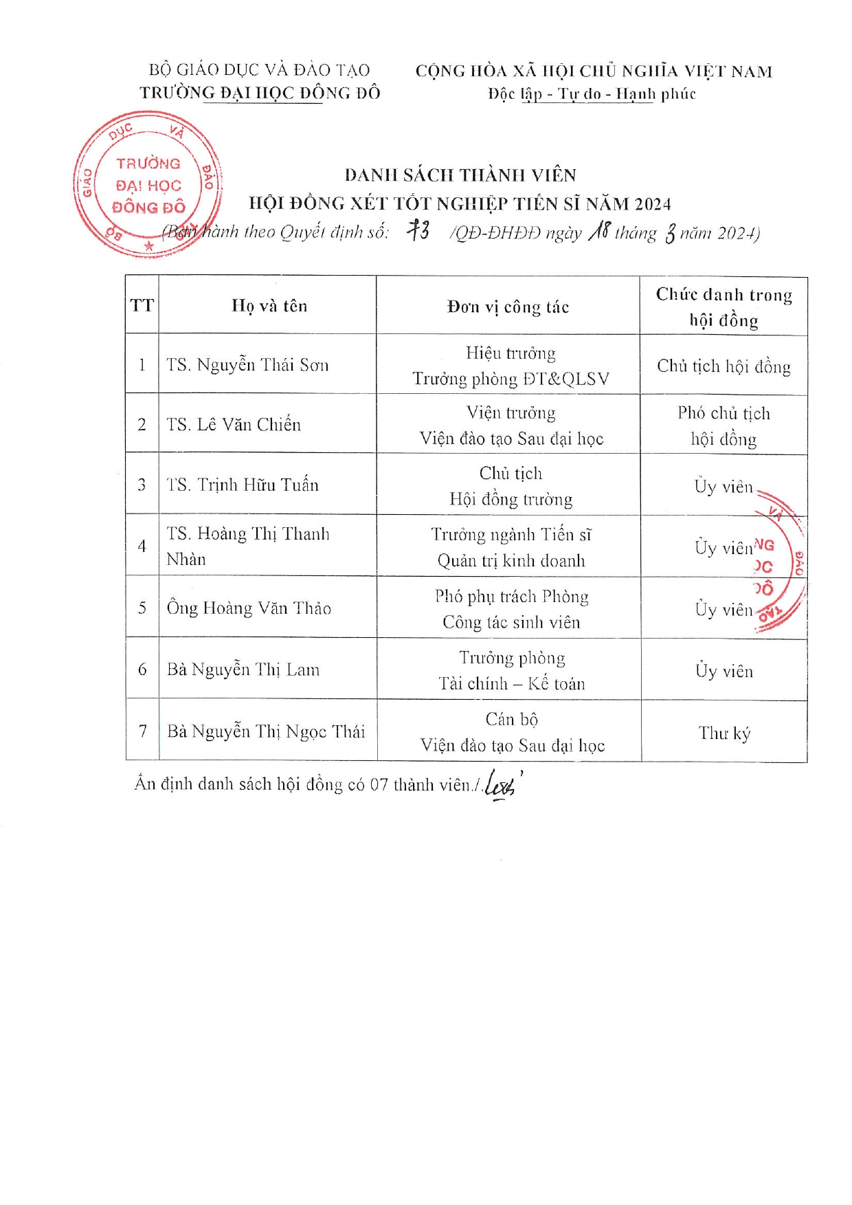 Trường Đại học Đông Đô thông báo Quyết định thành lập hội đồng xét tốt nghiệp Tiến sĩ năm 2024. Chi tiết về quyết định được đính kèm dưới đây.