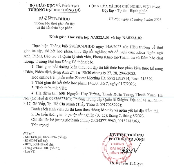 Thông báo thời gian ôn tập và thi kết thúc học phần học viên lớp NA822A.01 và lớp NA822A.02