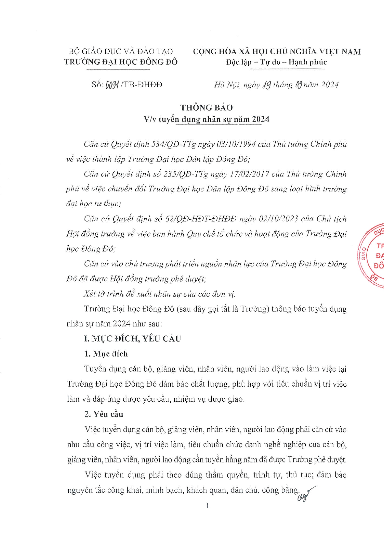 Trường Đại học Đông Đô thông báo tuyển dụng nhân sự năm 2024, chi tiết các vị trí tuyển dụng được đính kèm theo danh sách dưới đây.