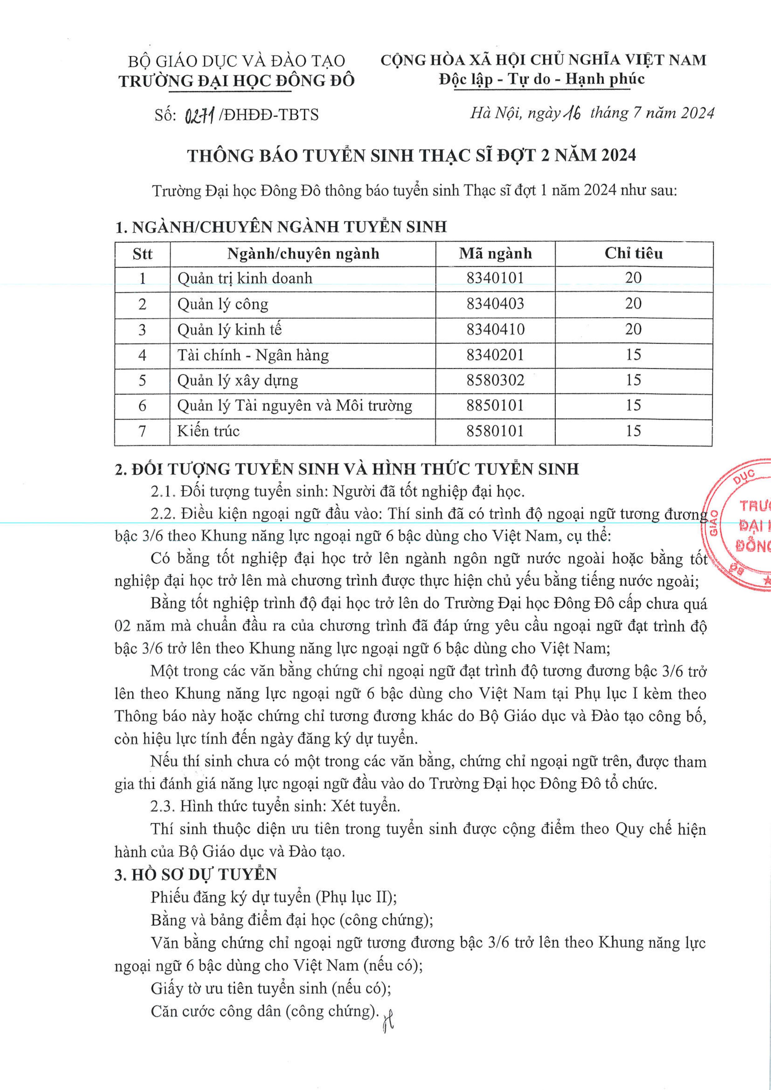 Xem chi tiết toàn văn thông báo tuyển sinh trình độ Thạc sĩ đợt 2 năm 2024 của Trường Đại học Đông Đô TẠI ĐÂY