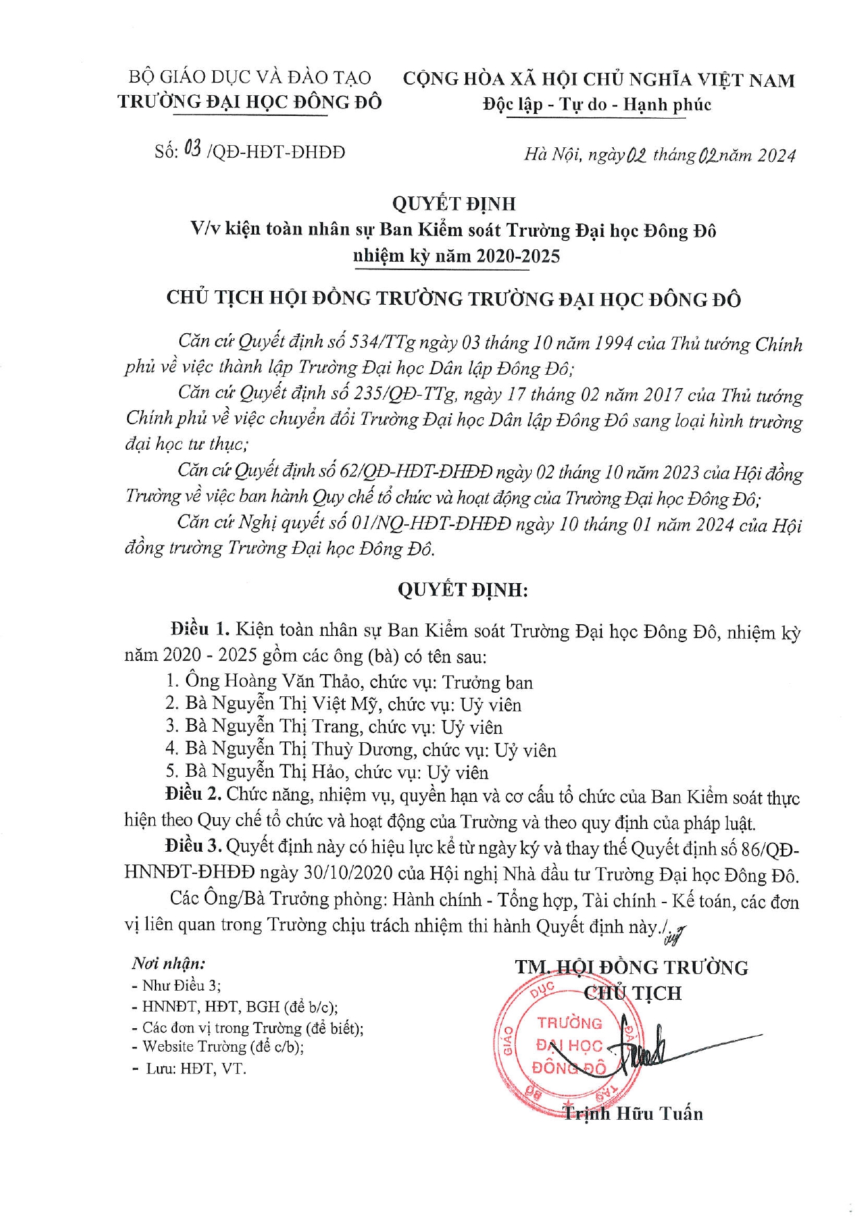 Trường Đại học Đông Đô thông báo về việc kiện toàn nhân sự Ban kiểm sát Trường Đại học Đông Đô nhiệm kỳ 2020 - 2025. Theo đó, nhân sự Ban kiểm soát gồm các ông/bà sau đây. Chi tiết toàn văn quyết định kiện toàn nhân sự Ban kiểm soát được đăng tải dưới đây.