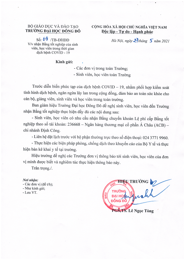 Thông báo về việc nhận Bằng tốt nghiệp của sinh viên, học viên trong thời gian dịch bệnh covid-19