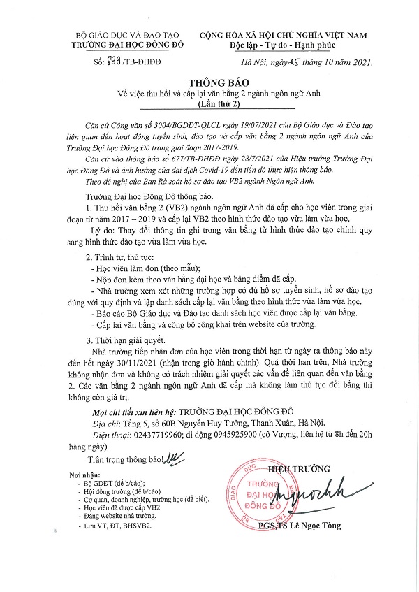 Thông báo về việc thu hồi và cấp lại văn bằng 2 ngành Ngôn ngữ Anh (lần thứ 2)