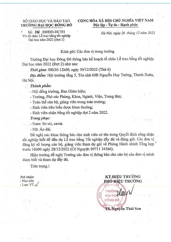 Thông báo về việc tổ chức Lễ trao bằng tốt nghiệp đại học năm 2022 (đợt 2)