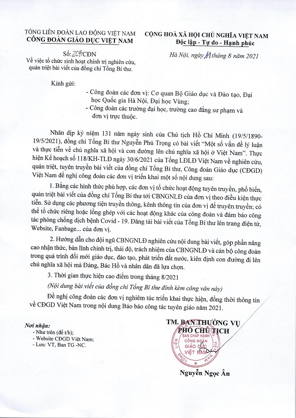 Thực hiện kế hoạch số 118/KH-TLD ngày 30/06/2021 của Công đoàn Giáo dục Việt Nam về việc tổ chức sinh hoạt chính trị nghiên cứu,