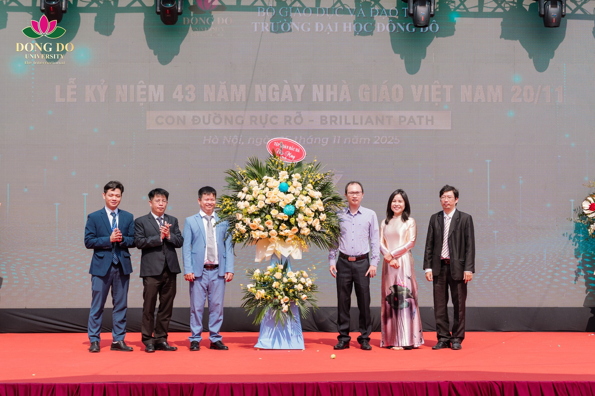 Buổi lễ có sự tham dự của ThS. Trần Thị Hương - Đại diện nhà đầu tư, Phó Chủ tịch Hội đồng trường; ThS. Nguyễn Thế Sơn - Phó Chủ tịch Hội đồng trường, Phó Hiệu trưởng; Đồng Chí Hoàng Đức Hà - Phó Bí thư Đảng ủy, TS. Nguyễn Đình Tân - Phó Hiệu trưởng phụ trách trường; TS. Lê Thị Dung - Phó Hiệu trưởng; TS. Nguyễn Anh Tuấn - Phó Hiệu trưởng và ThS. Trần Khắc Hưng - Phó Hiệu trưởng cùng các quý thầy cô giảng viên các khoa, đại diện doanh nghiệp, đối tác chiến lược và đông đảo sinh viên toàn trường. Đặc biệt hơn cả, Nhà trường vinh dự đón tiếp hai thầy là những người sáng lập Trường Đại học Đông Đô – những nhân chứng của hành trình hình thành và phát triển suốt hơn ba thập kỷ của trường: GS.TSKH Trần Hữu Phát, Thành viên sáng lập, nguyên Chủ tịch Hội đồng Quản trị; GS.TS Phan Văn Hạp, Thành viên sáng lập, nguyên Hiệu trưởng. Sự hiện diện của hai thầy tại buổi lễ mang ý nghĩa biểu tượng, gợi nhắc về những giá trị nền tảng mà Nhà trường luôn kế thừa và phát huy.