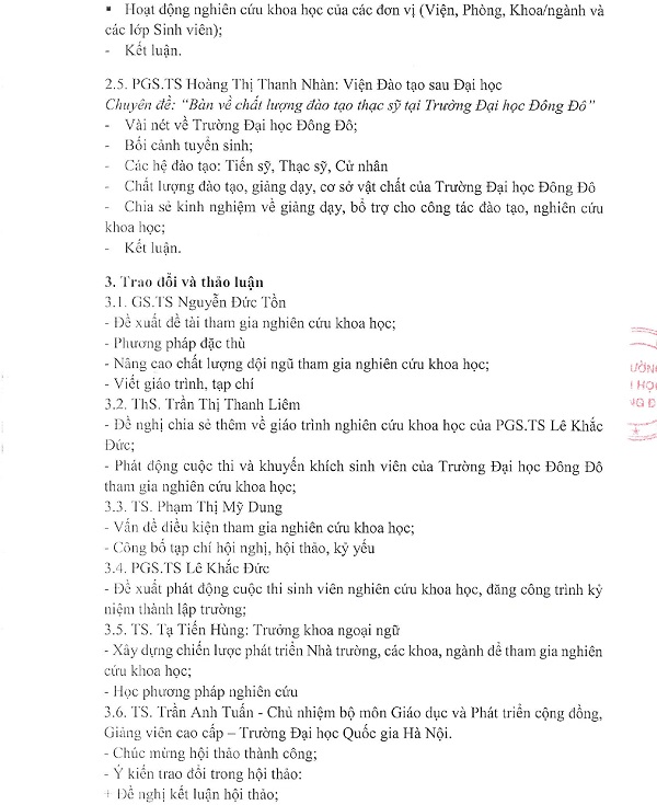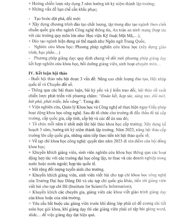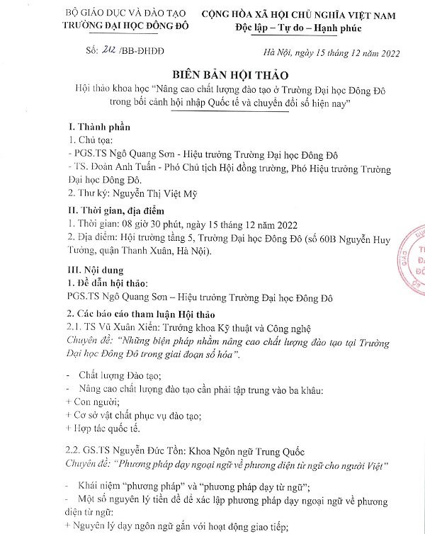 Biên bản hội thảo khoa học "Nâng cao chất lượng đào tạo ở trường Đại học Đông Đô trong bối cảnh hội nhập quốc tế và chuyển đổi s