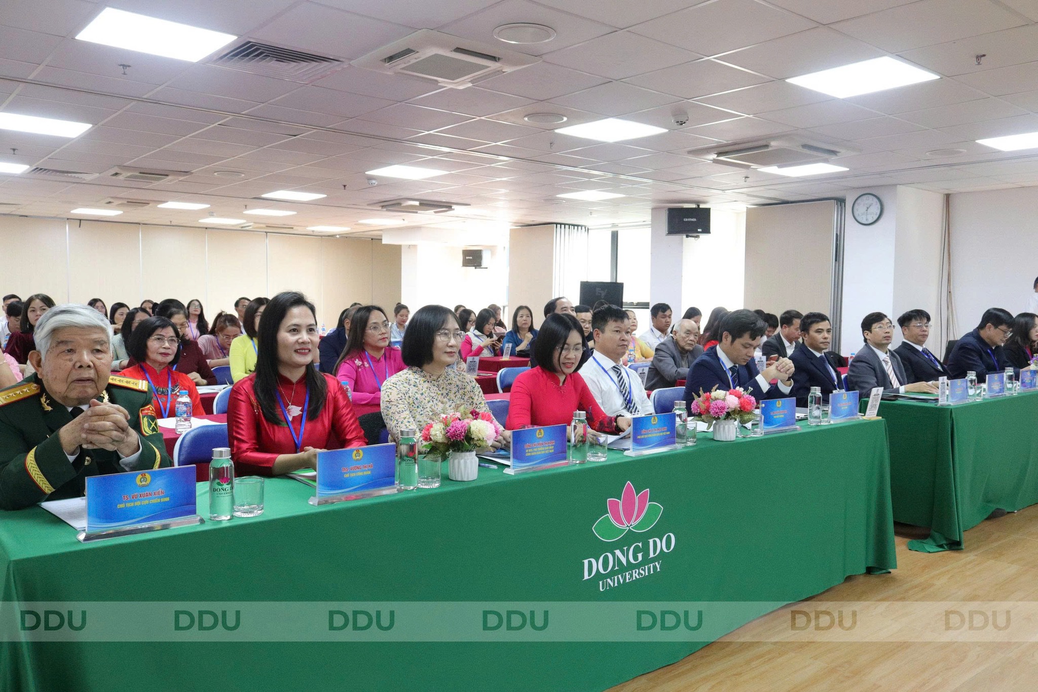 Về phía Nhà trường có TS. Nguyễn Anh Tuấn - Hiệu trưởng Nhà trường; ThS. Nguyễn Thế Sơn - Phó Chủ tịch HĐT, Phó Hiệu trưởng Nhà trường; TS. Nguyễn Đình Tân - Phó Hiệu trưởng Nhà trường; ThS. Trần Khắc Hưng - Phó Hiệu trưởng Nhà trường; ThS. Hoàng Đức Hà - Phó Bí thư Đảng ủy Nhà trường; ThS. Vương Thị Hà - Chủ tịch Công đoàn Trường. Cùng tham dự là các đại biểu đại diện cho Đoàn Thanh niên, Hội cựu chiến binh, các lãnh đạo phòng ban, viện, trung tâm và 68 công đoàn viên Trường Đại học Đông Đô.