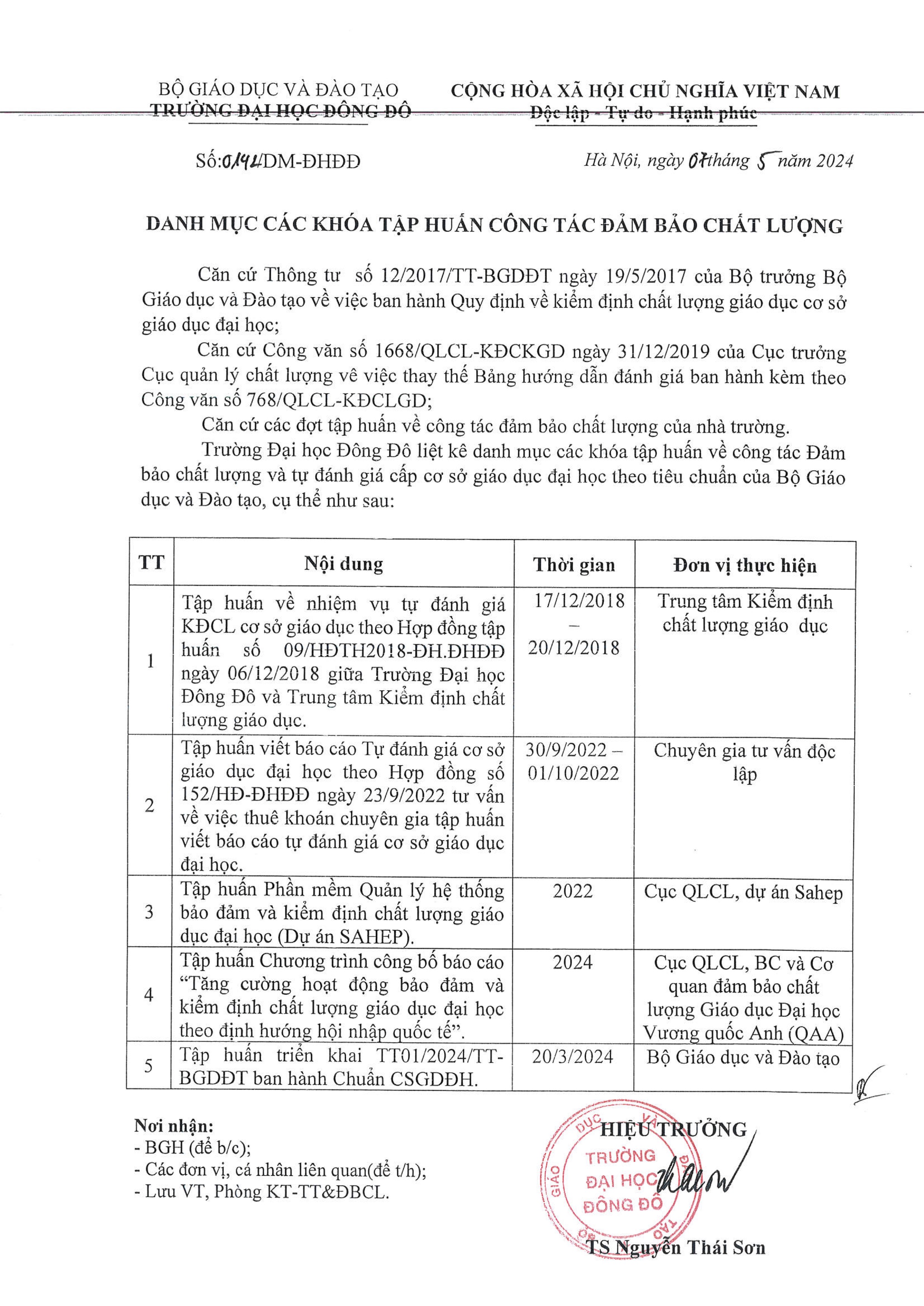 Danh mục số 0142/DM-ĐHĐĐ các khóa tập huấn công tác đảm bảo chất lượng