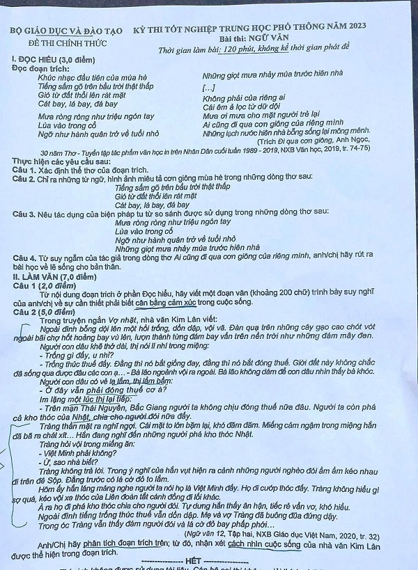 Đáp án chính thức môn Ngữ Văn kỳ thi THPT Quốc gia 2023
