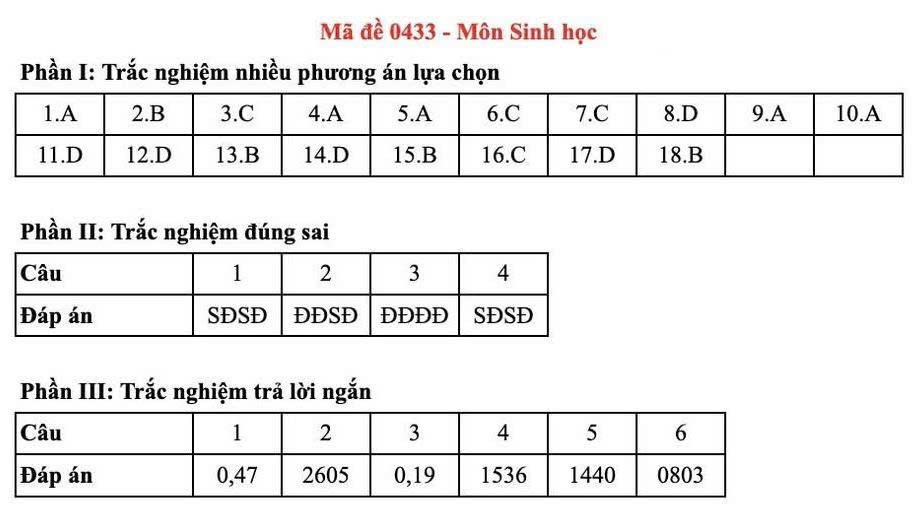 Dưới đây là đáp án tham khảo đề thi môn Sinh học tốt nghiệp THPT QG năm 2025 - Tất cả mã đề KHÔNG phải đáp án chính xác bởi Bộ GD&ĐT: