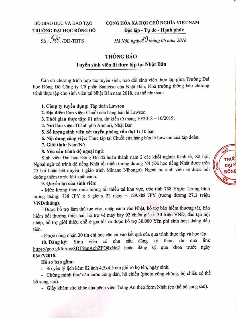 Dưới đây là thông tin về chương trình thực tập tại Nhật Bản cho sinh viên Đại học Đông Đô năm 2018; và tổng hợp những câu hỏi phổ biến nhất về những điều cần biết khi đi thực tập tại Nhật Bản. Các bạn cùng tham khảo nhé!