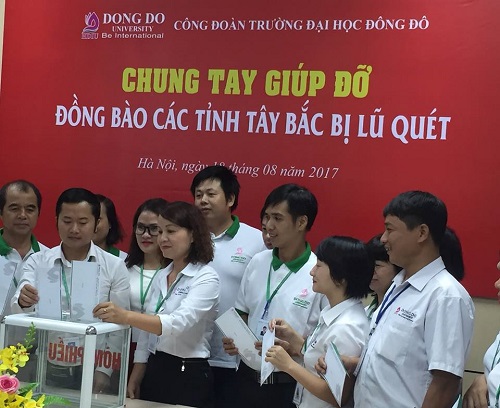 Chung tay cùng nhân dân cả nước hỗ trợ đồng bào các tỉnh miền núi phía Bắc đang bị ảnh hưởng bởi thiên tai, Công đoàn trường Đại học Đông Đô đã phát động chương trình quyên góp đến toàn thể đoàn viên công đoàn. Ngày 18-8, TS. Dương Văn Hòa - Hiệu trưởng nhà trường, cô Phan Quỳnh Mai – Chủ tịch Công đoàn trường cùng toàn thể cán bộ, giảng viên trường Đại học Đông Đô đã dành mỗi người ít nhất 1 ngày lương để ủng hộ, góp phần giúp đỡ nhân dân vùng lũ sớm khắc phục hậu quả thiên tai, dần khôi phục sản xuất và ổn định cuộc sống.