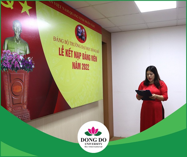 Trước cờ Tổ quốc, cờ Đảng và chân dung Chủ tịch Hồ Chí Minh đồng chí Trương Thị Lan đã đọc lời tuyên thệ nguyện trung thành với mục tiêu và lý tưởng của Đảng, nỗ lực phấn đấu để xứng đáng là đảng viên Đảng Cộng Sản Việt Nam. Phát biểu tại buổi lễ, đồng chí Phạm Ngọc Đóa - Bí thư Đảng ủy đã chúc mừng đồng chí Trương Thị Lan khi được vinh dự đứng vào hàng ngũ của Đảng Cộng sản Việt Nam sau một thời gian được bồi dưỡng, thử thách; đồng thời, đồng chí cũng bày tỏ mong muốn đảng viên mới kết nạp sẽ tiếp tục giữ gìn phẩm chất đạo đức, nhiệt tình trong công tác, phát huy năng lực hơn nữa để cùng Chi bộ hoàn thành xuất sắc nhiệm vụ, góp phần xây dựng Đảng bộ Trường Đại học Đông Đô ngày càng phát triển.