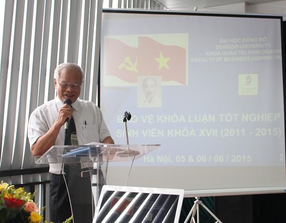 PGS, TS. Phạm Đình Phùng – Hiệu trưởng nhà trường phát biểu ý kiến chỉ đạo Hội đồng chấm khoá luận tốt nghiệp khoa Quản trị kinh doanh năm 2015 và chúc mừng sinh viên khoá XVII tại lễ bảo vệkhoá luận tốt nghiệp ngày 05/06/2015. Thầy khẳng định đây là một sự kiện lớn, có ý nghĩa vô cùng quan trọng với trường nói chung và các bạn sinh viên K17 QTKD nói riêng. Đây là sự kiện đánh đấu bước ngoặt trưởng thành của các bạn sinh K17 QTKD.