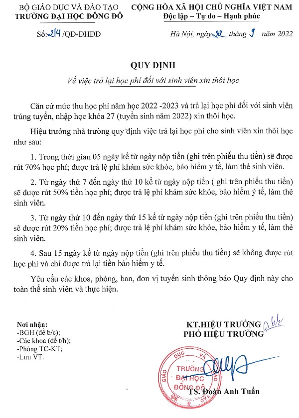 Quy định về việc trả lại học phí đối với sinh viên xin thôi học