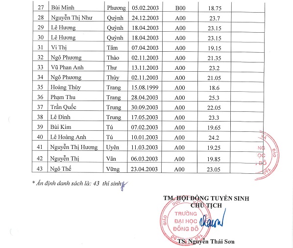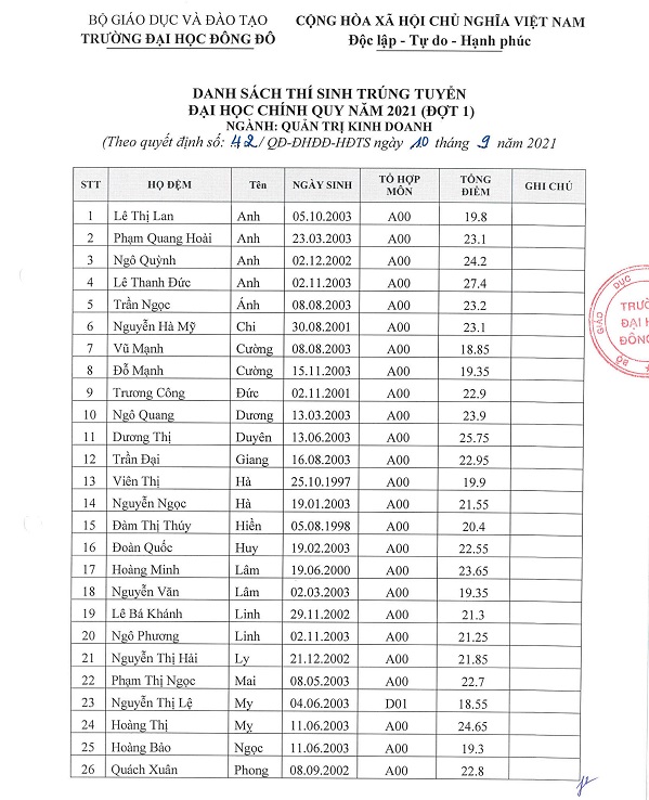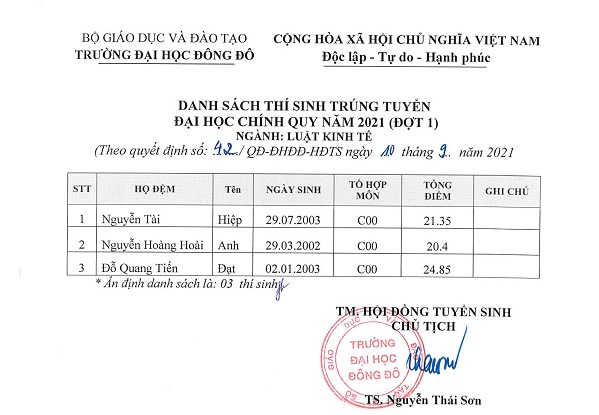 Quyết định công nhận thí sinh trúng tuyển đại học hệ chính quy năm 2021 (đợt 1)