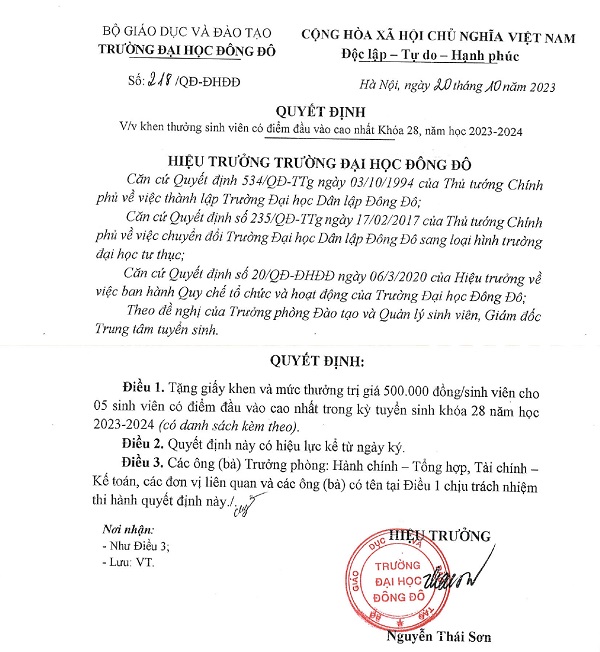 Quyết định khen thưởng sinh viên có điểm đầu vào cao nhất Khóa 28, năm học 2023 - 2024