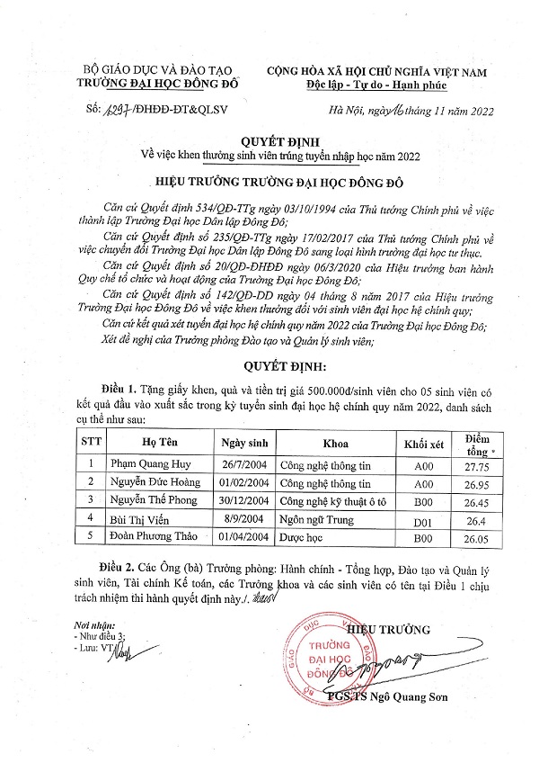 Quyết định khen thưởng sinh viên trúng tuyển nhập học năm 2022