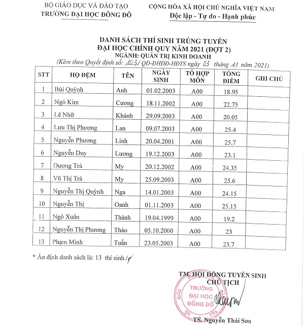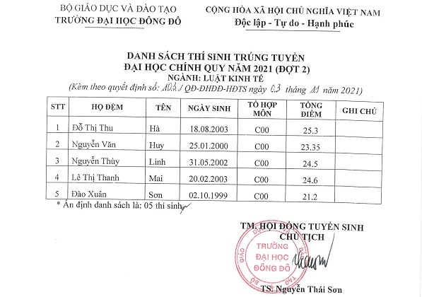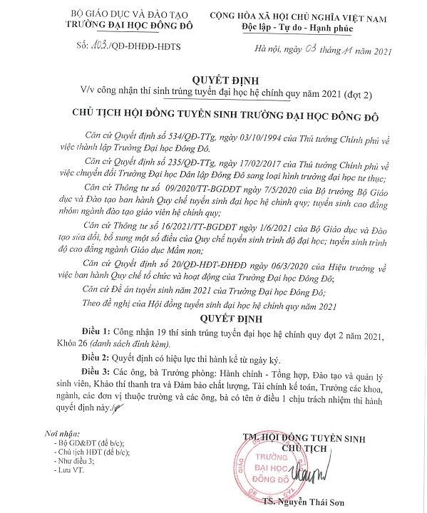 Quyết định về việc công nhận thí sinh trúng tuyển đại học hệ chính quy năm 2021 (đợt 2)