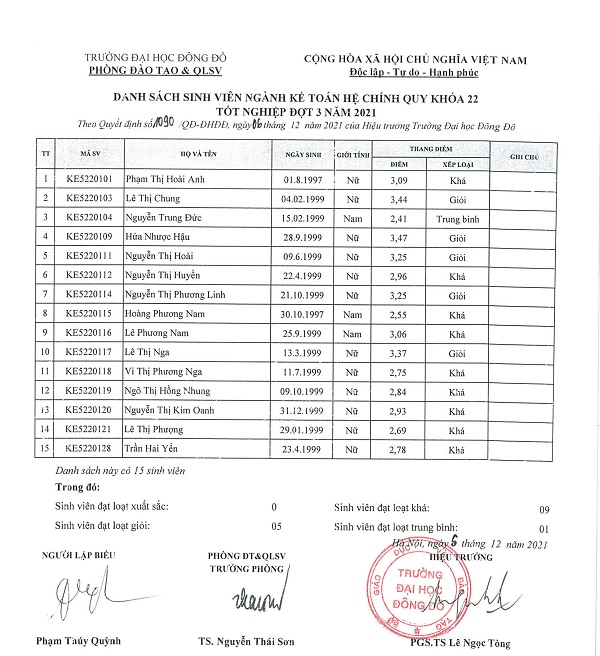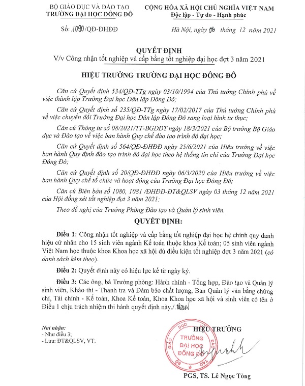 Quyết định về việc công nhận tốt nghiệp và cấp bằng tốt nghiệp đại học đợt 3 năm 2021