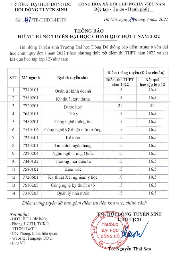 Thông báo điểm trúng tuyển đại học chính quy đợt 1 năm 2022