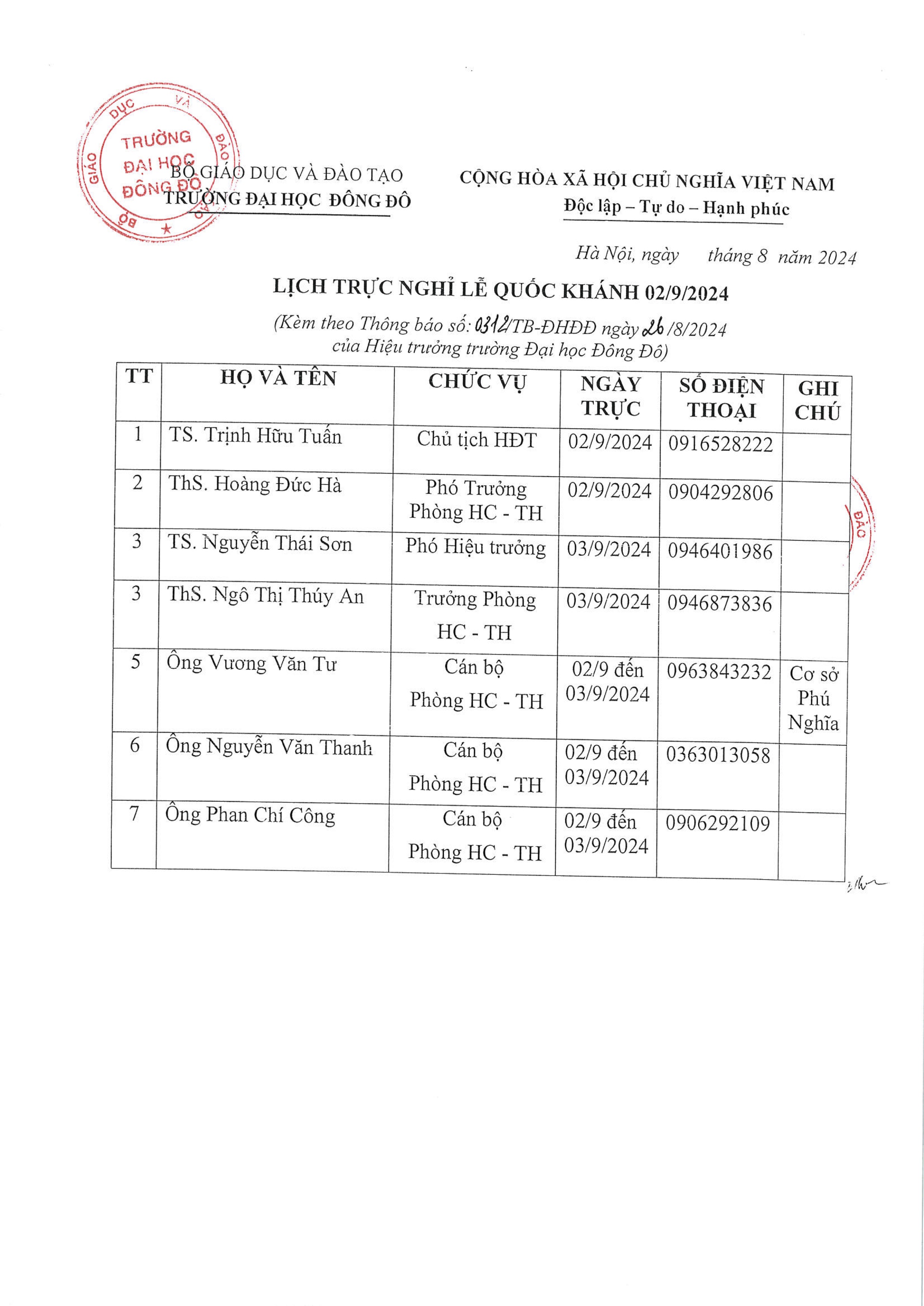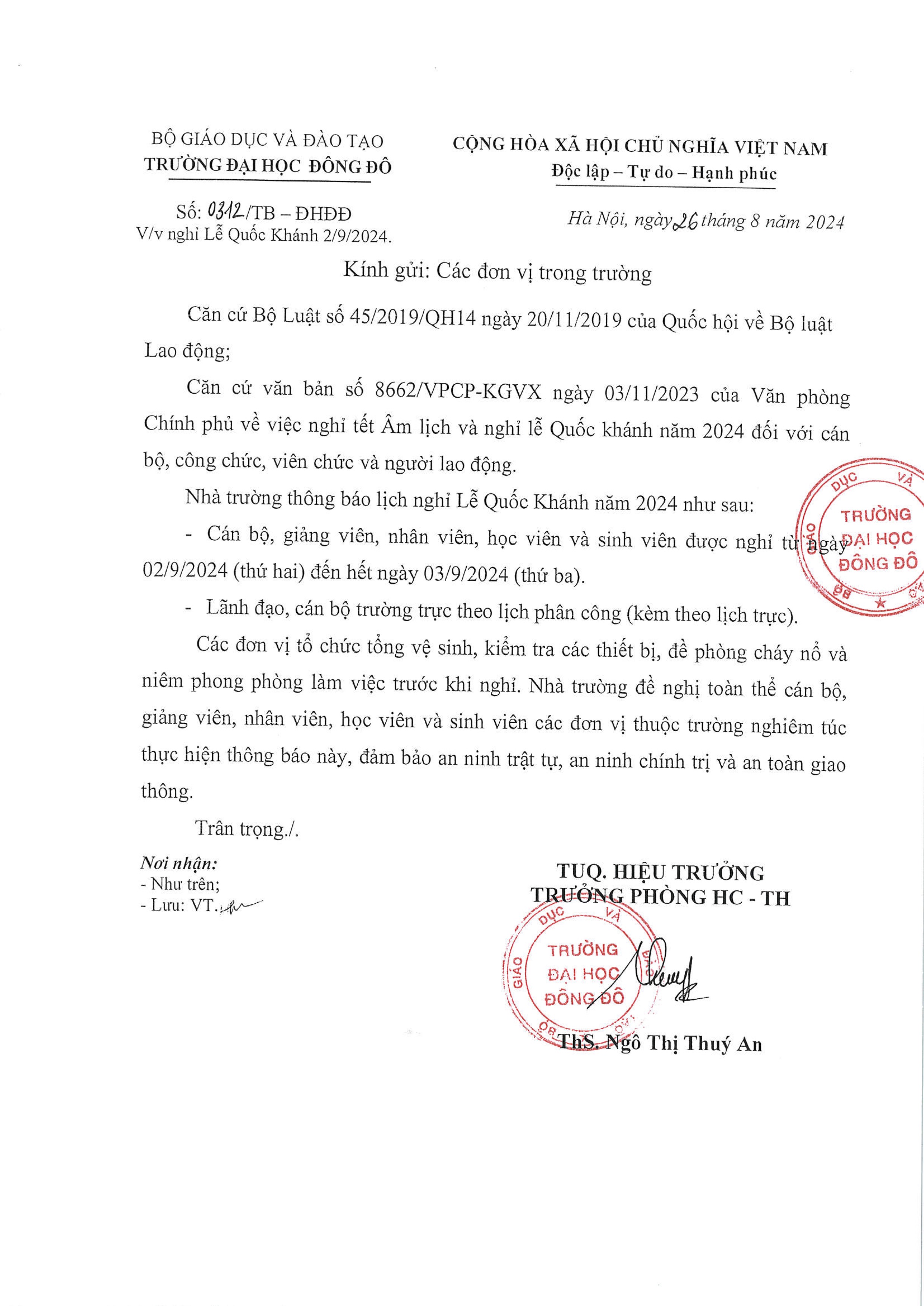 Thông báo lịch nghỉ Lễ Quốc Khánh 2/9/2024