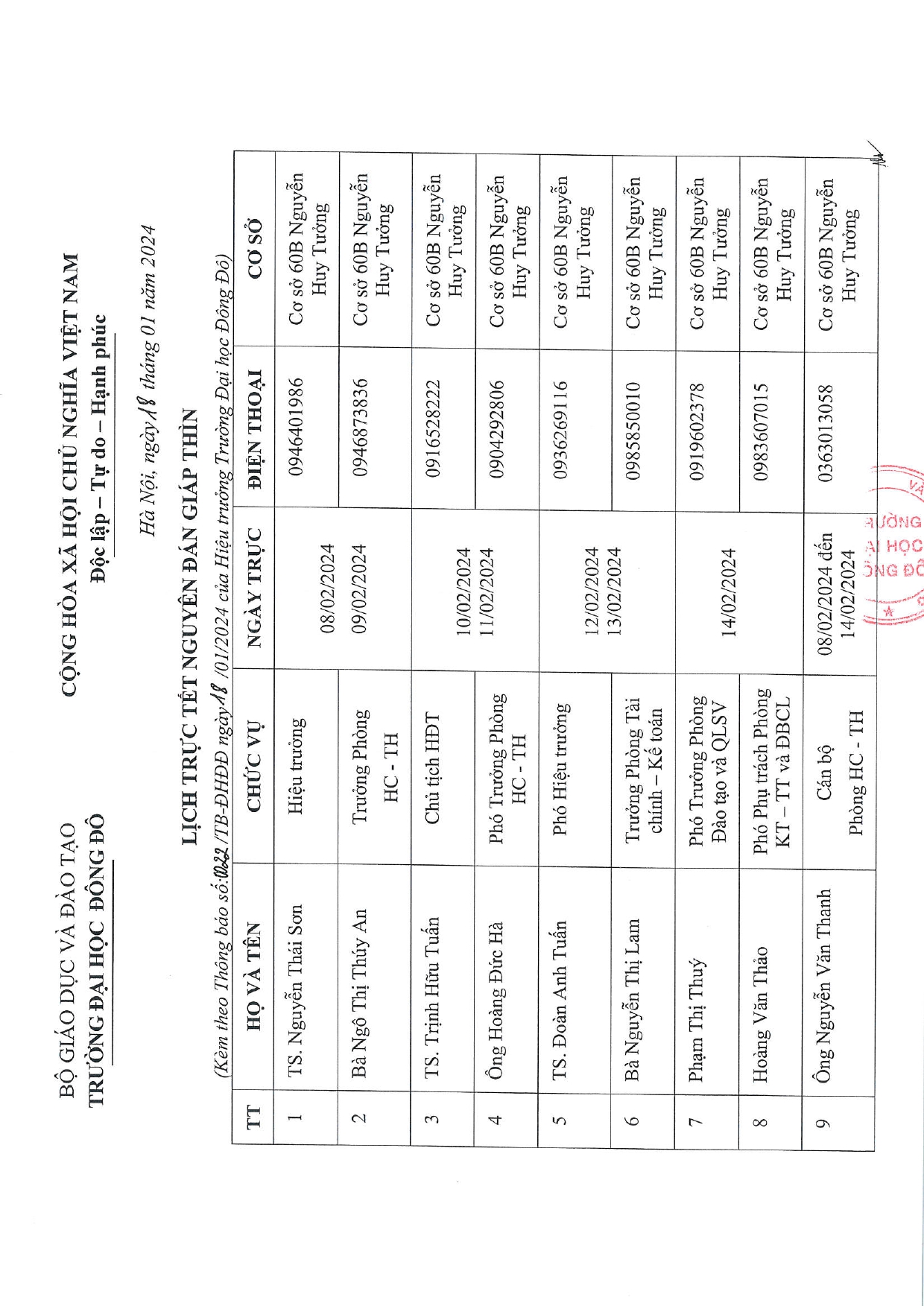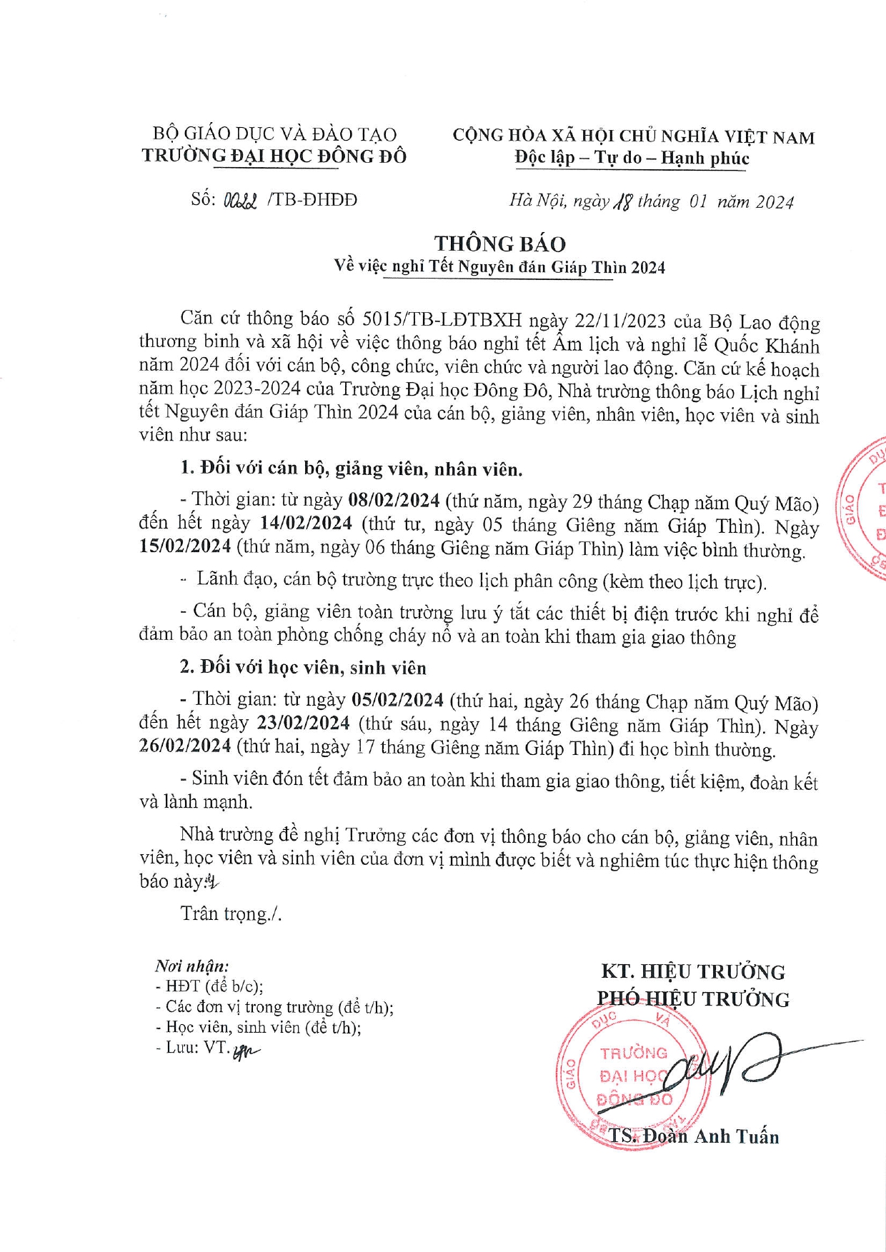 Căn cứ thông báo số 5015/TB-LĐTBXH ngày 22/11/2023 của Bộ Lao động thương binh và xã hội về việc thông báo nghỉ tết Âm lịch và nghỉ lễ Quốc Khánh năm 2024 đối với cán bộ, công chức, viên chức và người lao động. Căn cứ kế hoạch năm học 2023-2024 của Trường Đại học Đông Đô, Nhà trường thông báo Lịch nghỉ tết Nguyên đán Giáp Thìn 2024 của cán bộ, giảng viên, nhân viên, học viên và sinh viên. Chị tiết tại văn bản dưới đây: