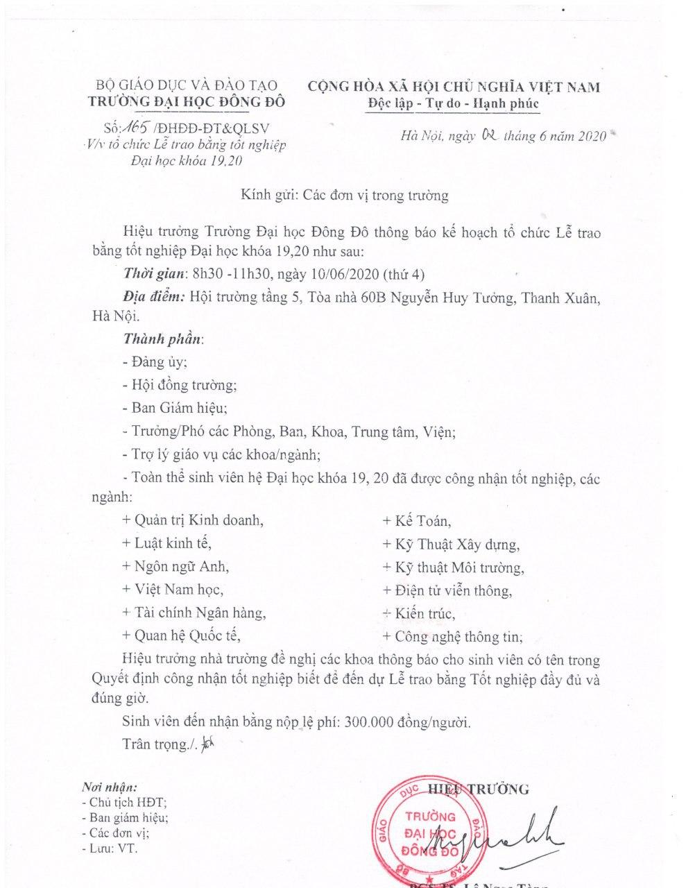 Thông báo Tổ chức Lễ trao bằng tốt nghiệp Đại học khóa 19,20