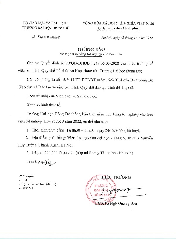 Thông báo trao bằng tốt nghiệp Thạc sĩ